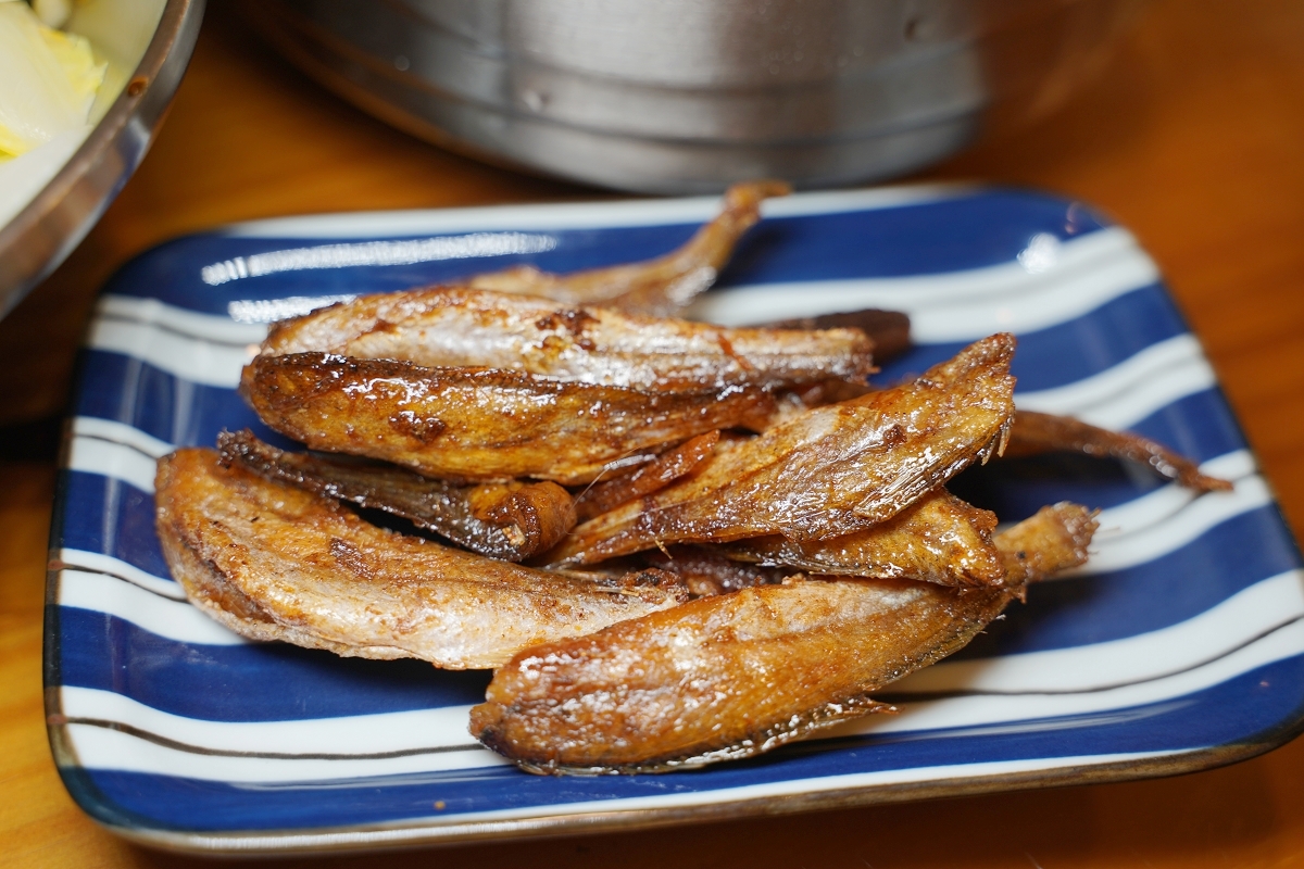 十三張紅油抄手的各式小菜均一價55元,這道香酥魚乾推薦必點,味道帶點甜、越嚼越香唷!!