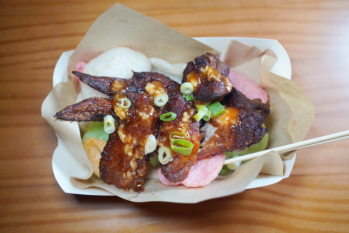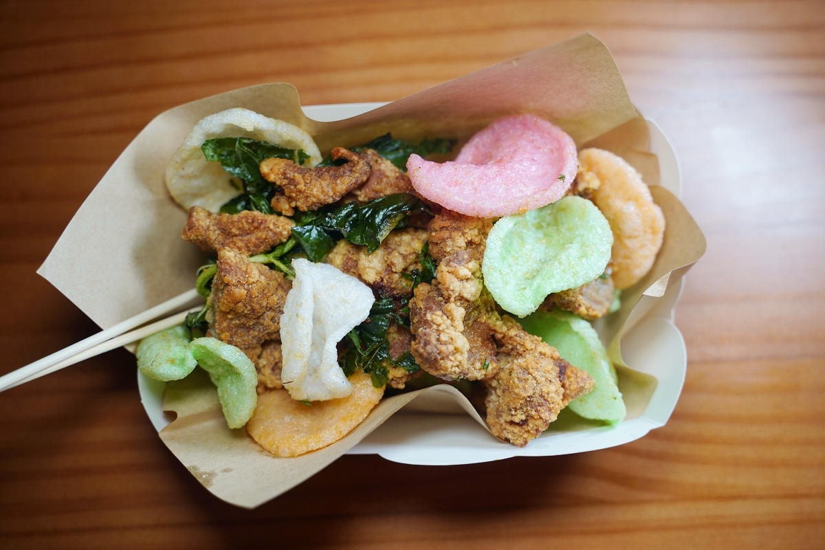 鹹香無比的台式鹹酥雞,肉汁豐富超美味,搭配九層塔簡直太加分,一旁還有酥脆的蝦餅真的超涮嘴