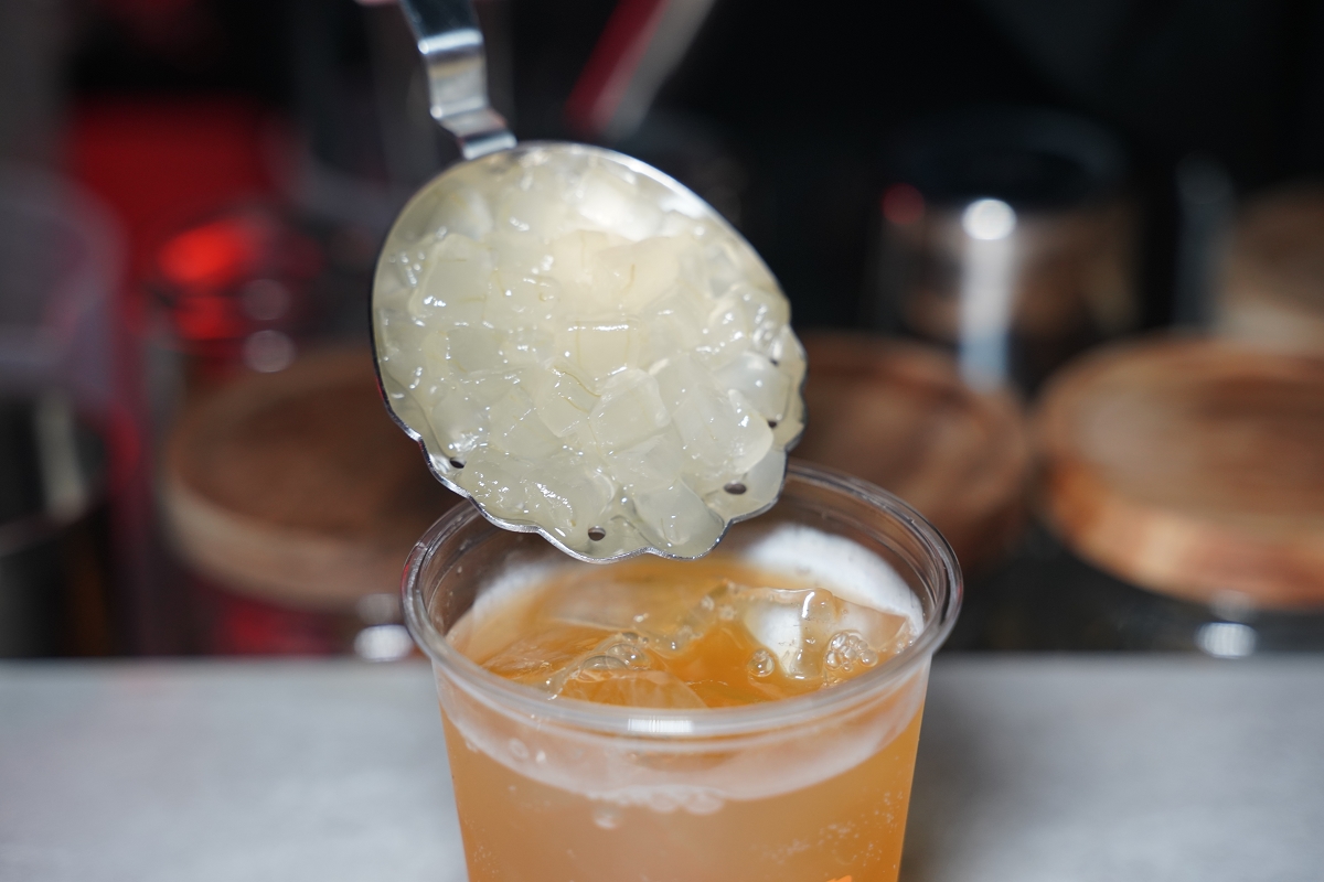 不醒人室的調酒還有一個特色,就是不同調酒會搭配不同的配料,就像是手搖飲一樣可以增加豐富口感,而且這些配料用的原料都是不同的酒品去製作而成