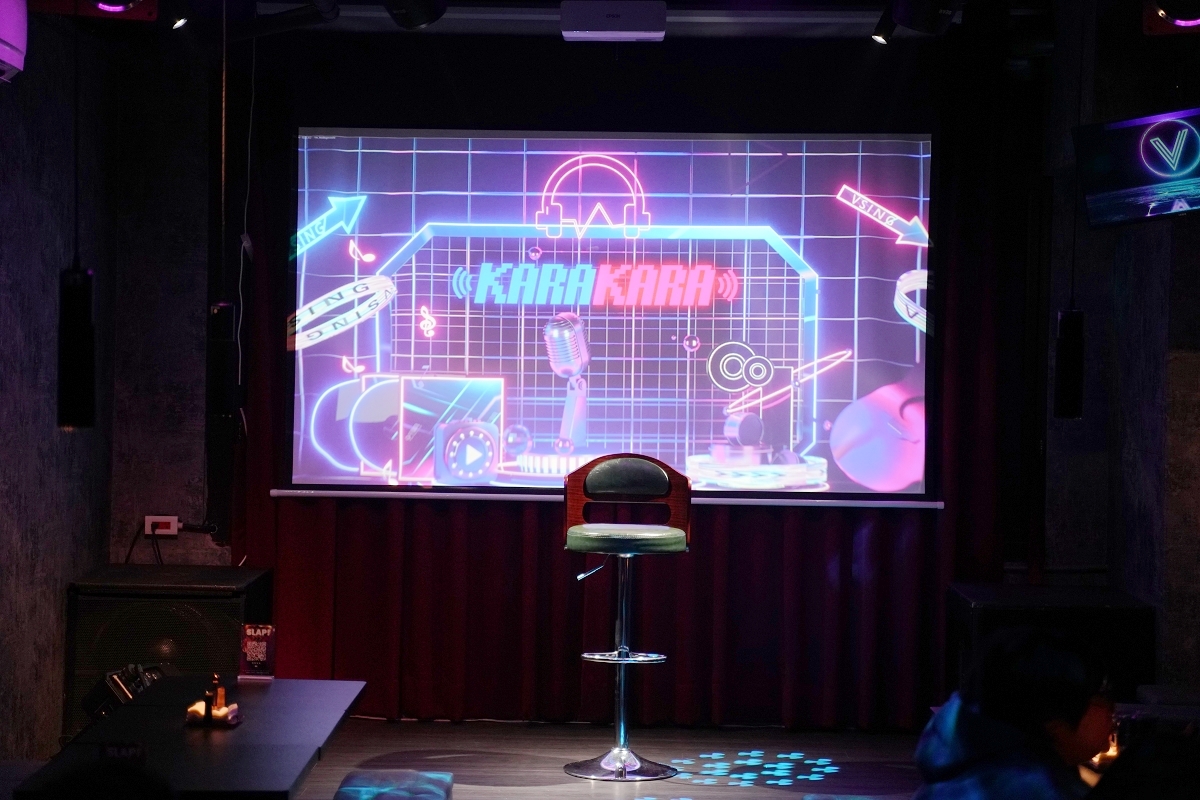 上到二樓就是SLAP!的專屬空間,在這裡可以看到一個歡唱舞台,只要內用就能透過專屬APP線上點歌歡唱,雖說有低消500元/每人,但可以免費歡唱其實還滿值得的