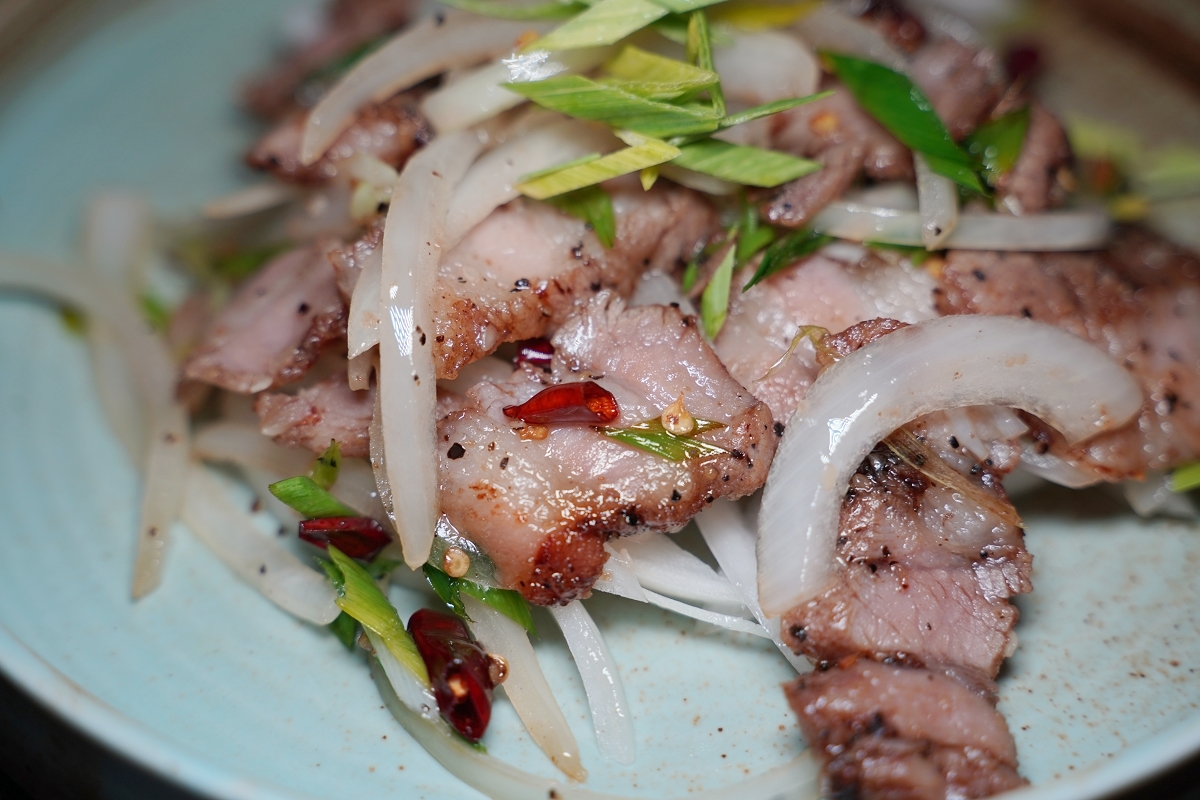 蒜苗鹹豬肉真的是一道下酒好菜,香煎鹹豬肉的油脂很香,讓人胃口大開,搭配蒜苗和洋蔥真的超對味,一口鹹豬肉一口shot,絕佳好夥伴