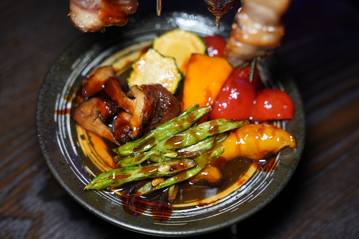 烤串下方還有一些烤蔬菜,烤串的醬汁都會滴落在盤裡,蔬菜會吸飽醬汁,吃起來超夠味的