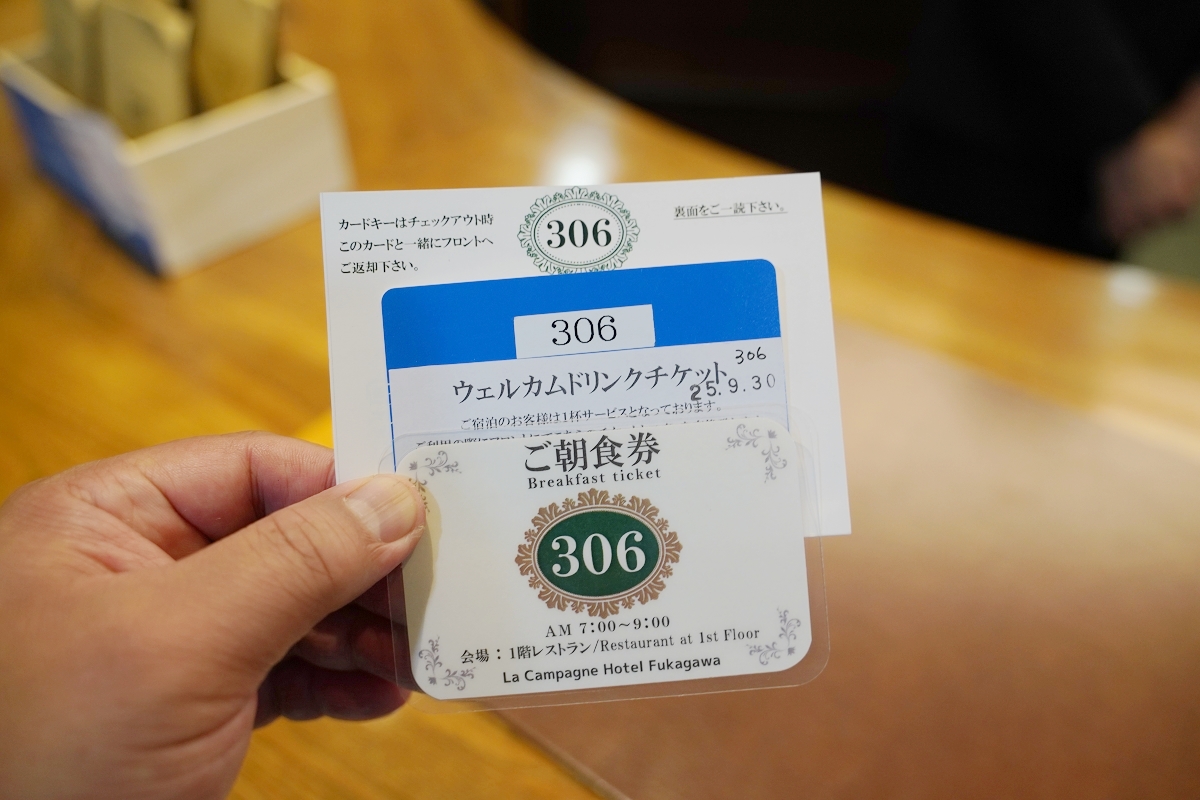 在櫃檯辦理好入住手續後會拿到感應房卡和隔天的早餐卷