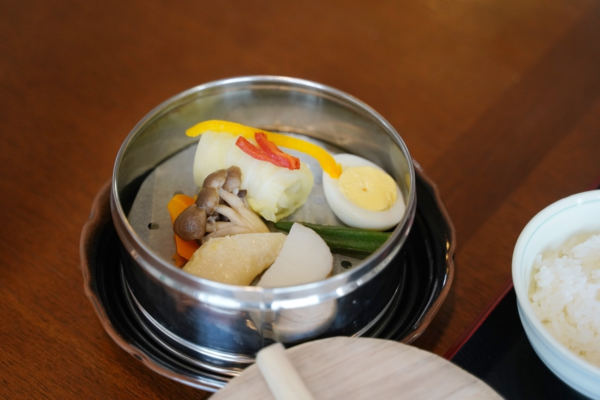 工作人員還會送上每人一份的蒸煮蔬食,有高麗菜捲、雞蛋、菇類、山藥、秋葵和胡蘿蔔,食材蒸煮的非常透,不會吃起來生生的感覺,好吃