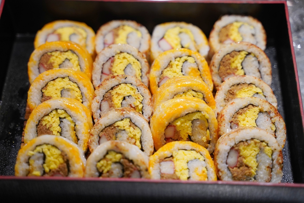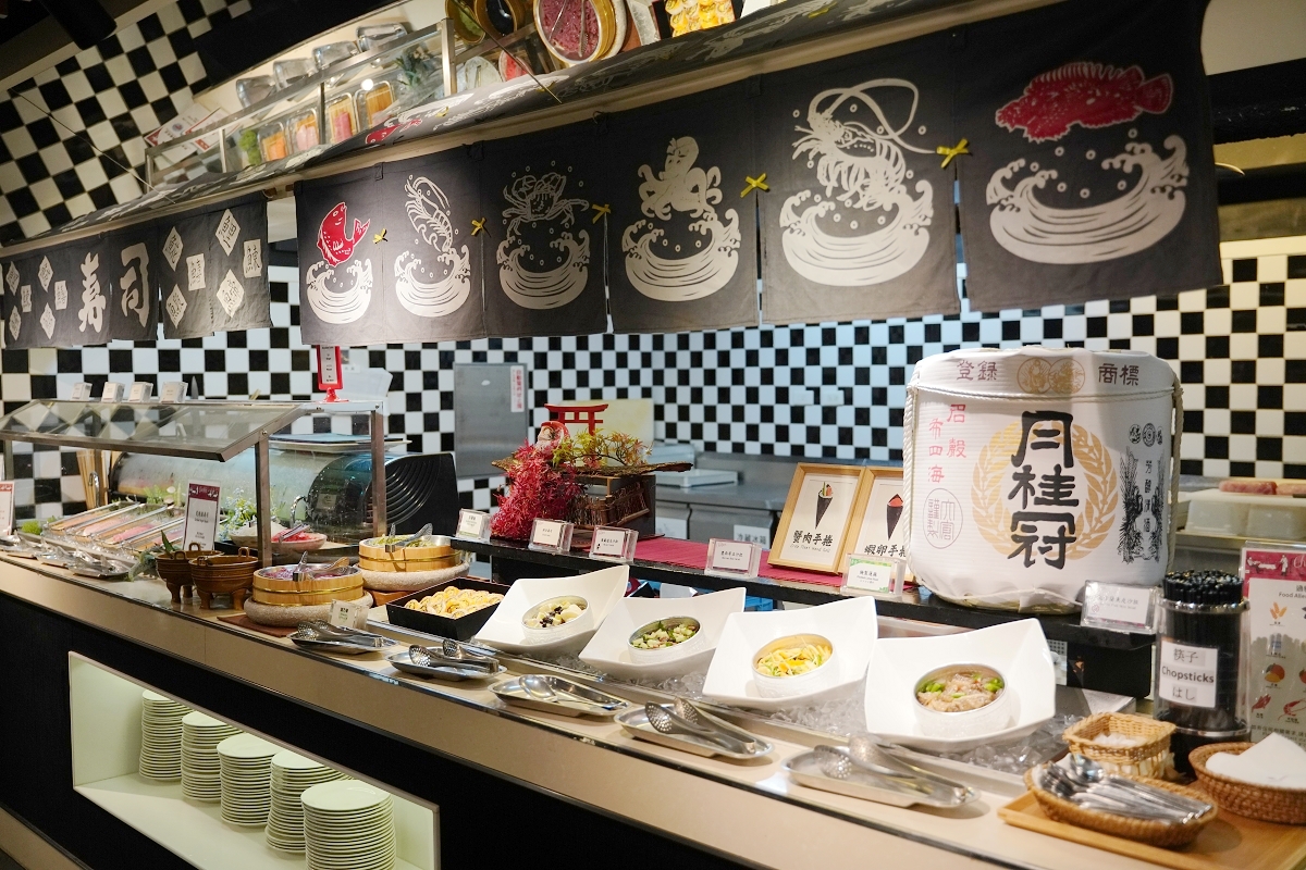 日式料理自助吧區,這裡有各種日式小菜、現做手卷、壽司和生魚片