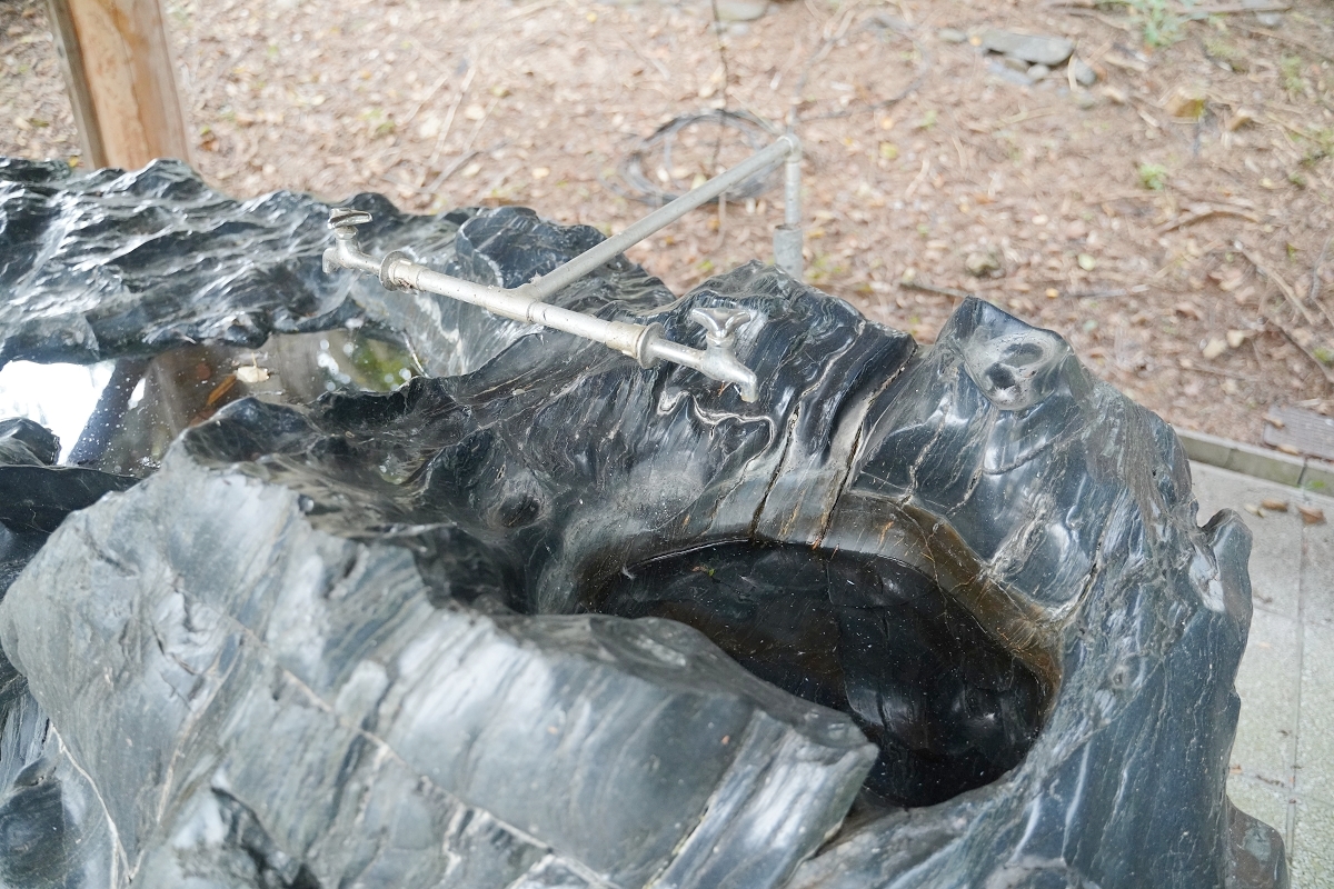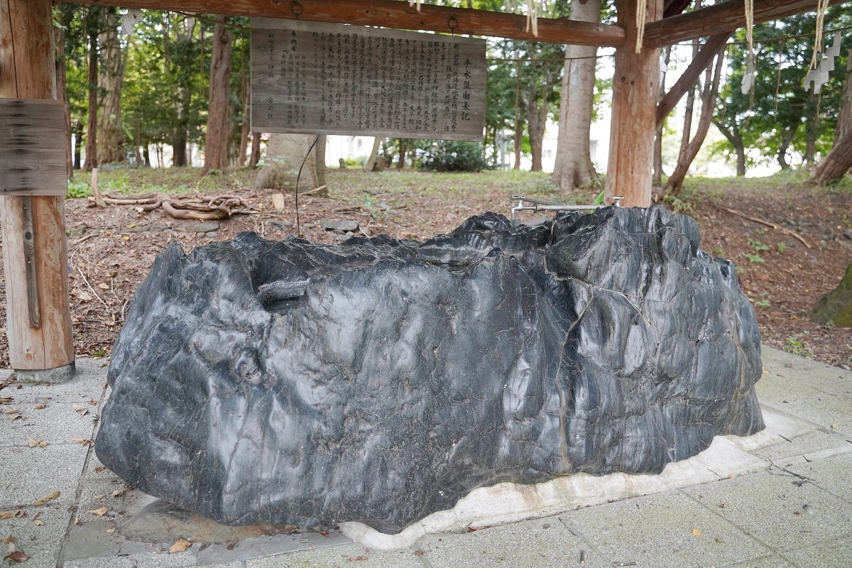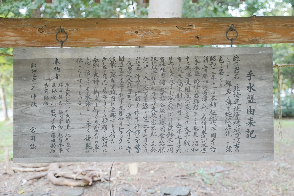 一旁有手水盤的介紹,原來這塊巨岩是北海道地層最古老的輝岩,呈綠色蛇紋
