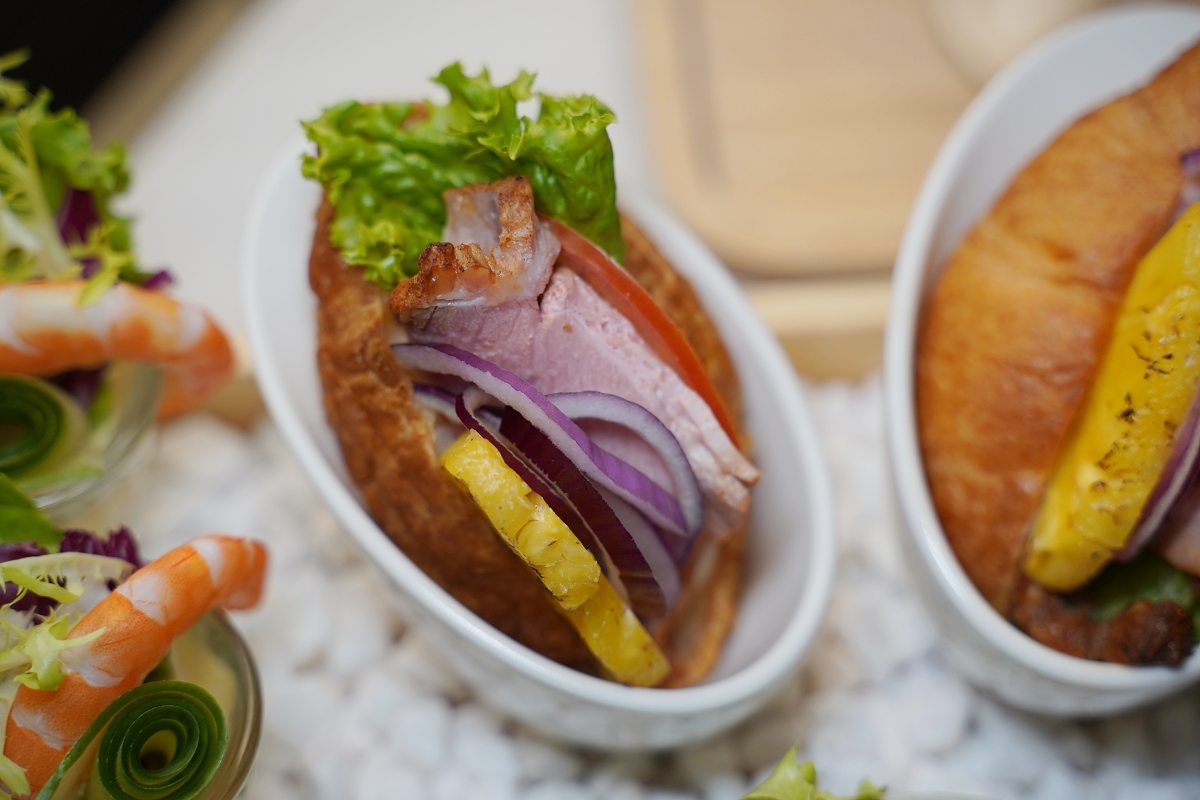 這份生菜可頌吃起來口感豐富,中間夾了不少食材,有洋蔥、熟成伊比利和鳳梨,味道很有層次感,大口咬下超滿足