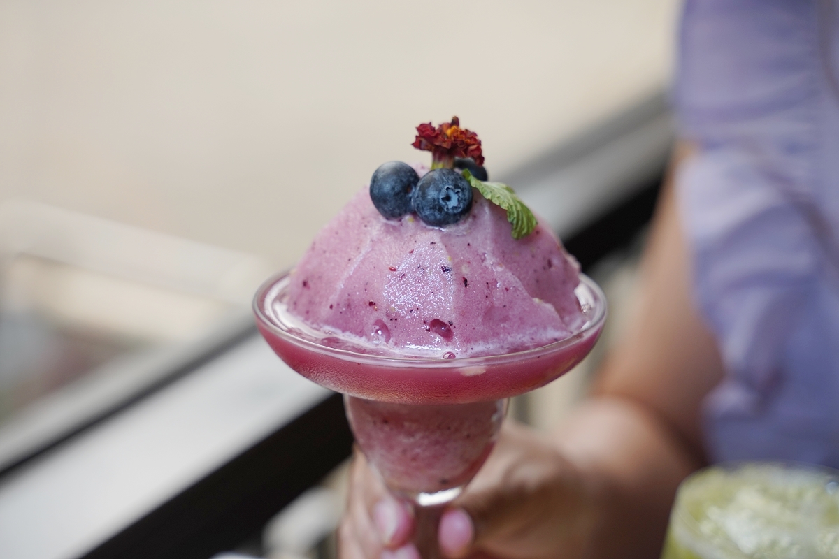 套餐可搭任兩杯飲品,有德國洋甘菊茶、德國玫瑰茶以及美式咖啡,或加99元升級夏日蔓越莓冰沙或奇異果氣泡蘇打,而這杯夏日蔓越莓冰沙喝起來酸酸甜甜的,冰沙口感越消暑的