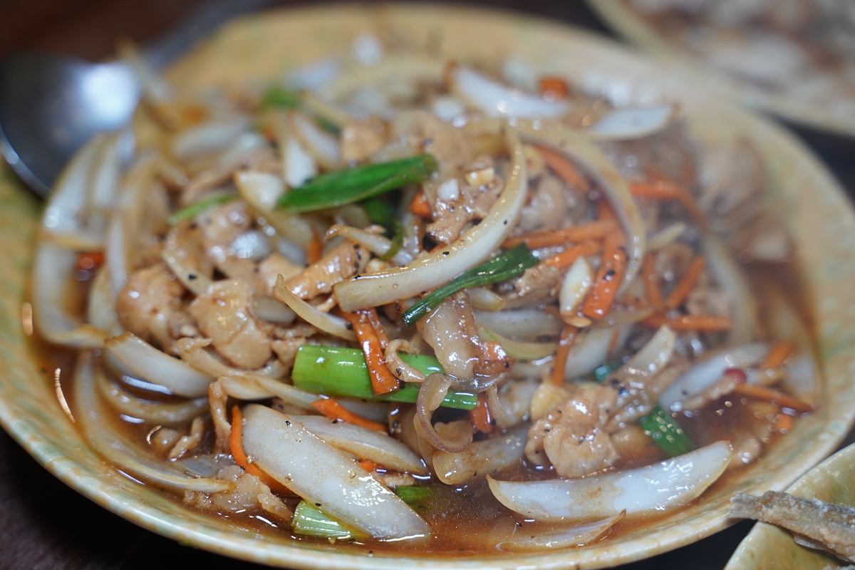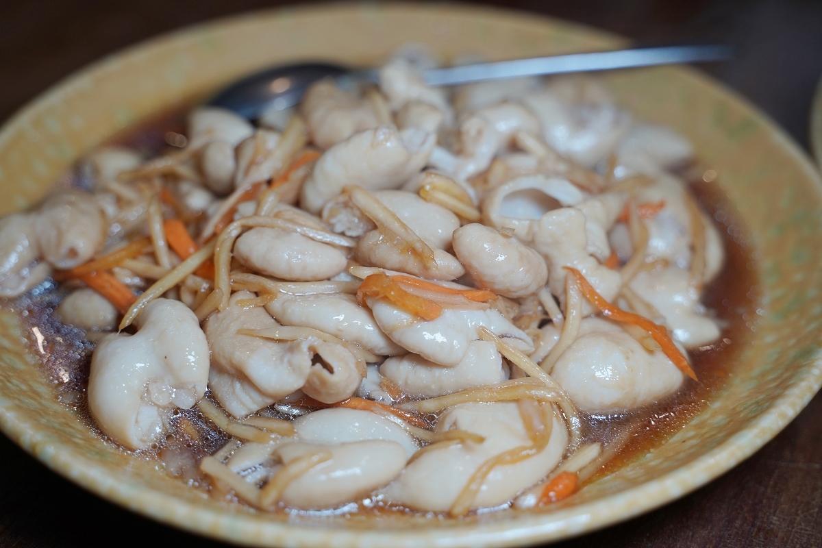薑絲大腸,大腸口感非常的Q、非常有嚼勁,味道很有酸度,會讓人一直流口水的那種酸,好吃