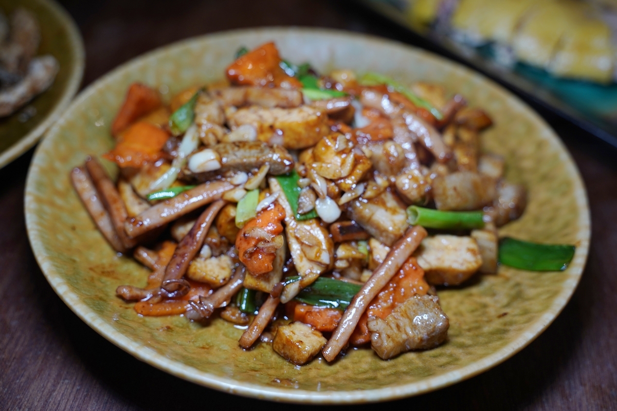 客家小炒,豆干和乾魷魚是越嚼越香