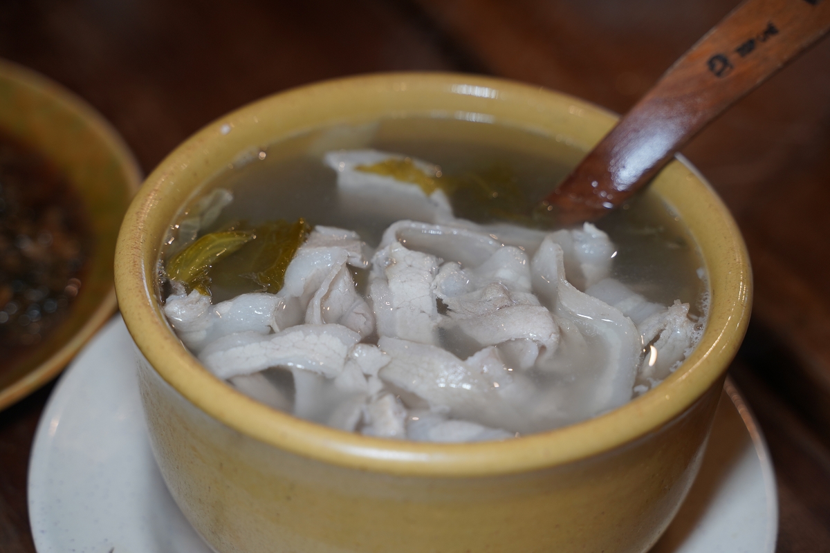 酸菜肉片湯,喝得到福菜本身的鹹、甘味以及肉片的鮮味,湯頭非常好喝唷!!