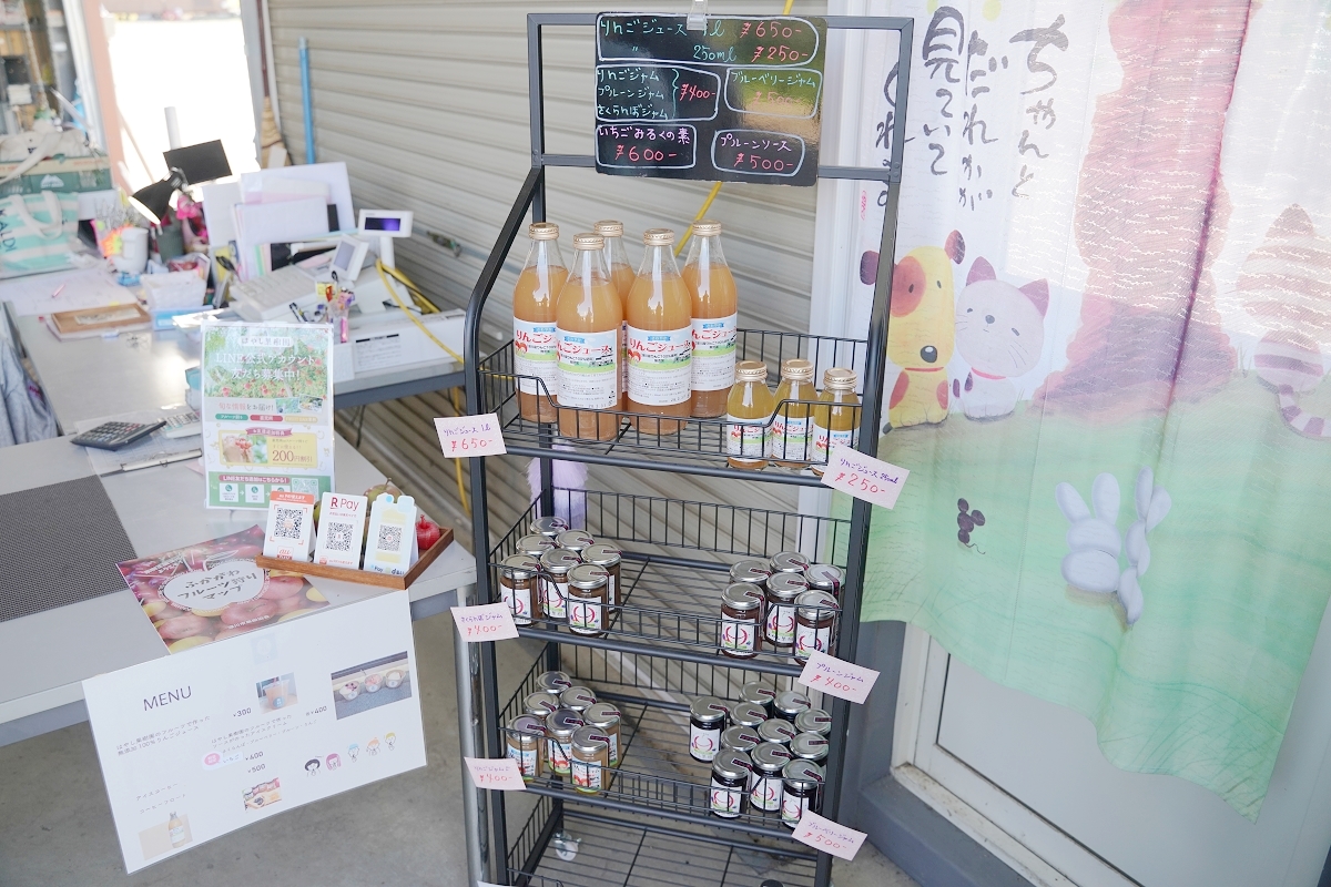 直販所內有各種はやし果樹園的自製商品和新鮮水果可以購買,櫃檯旁有自家水果製的果醬系列