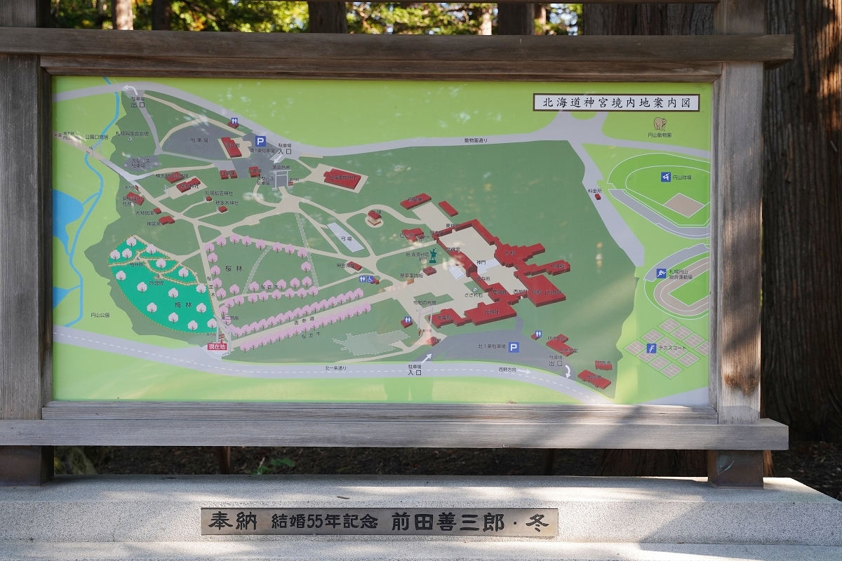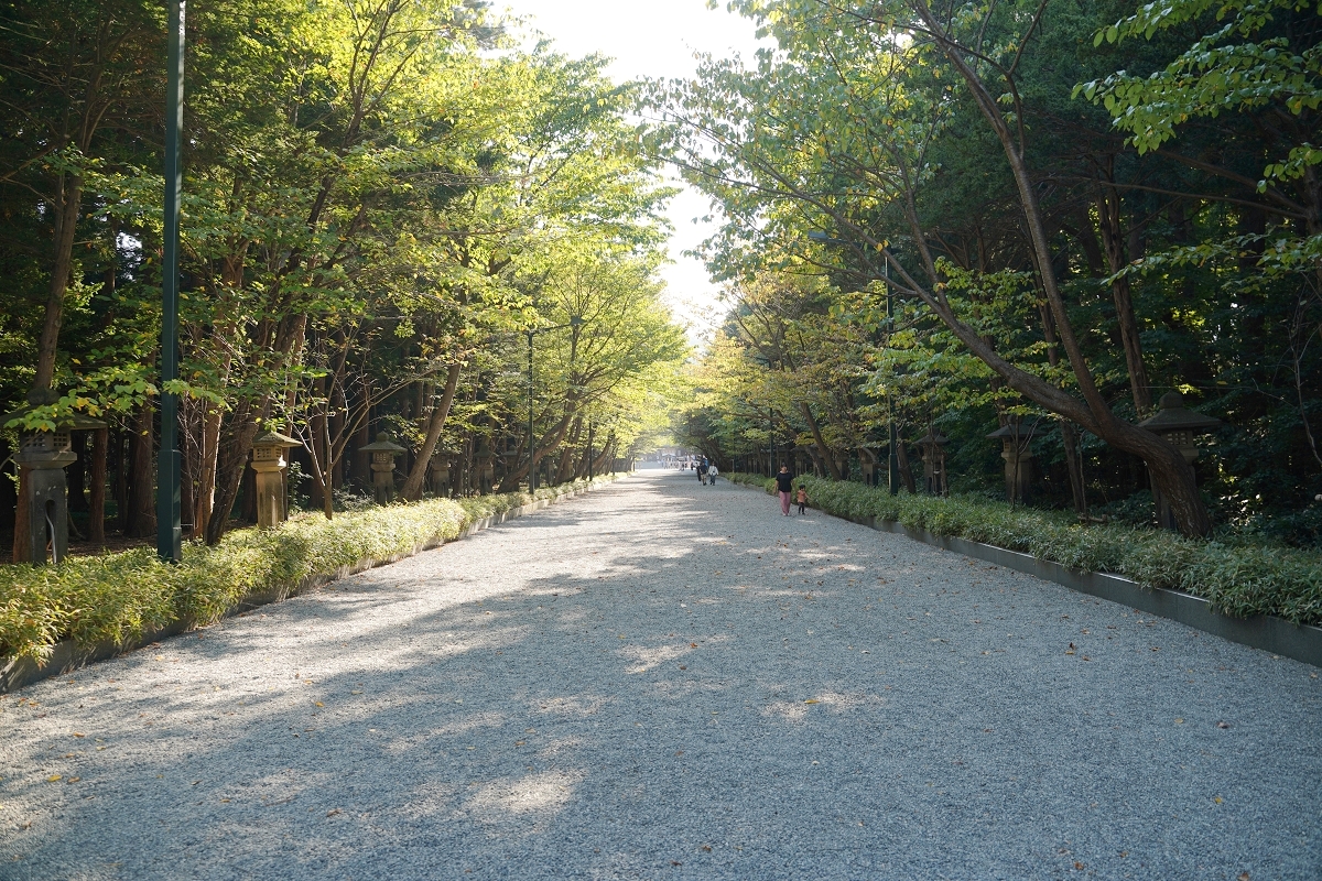 北海道神宮佔地非常寬廣,從入口處要走到拜殿會先經過一座森林公園,同時這裡也是賞梅、賞櫻的好去處