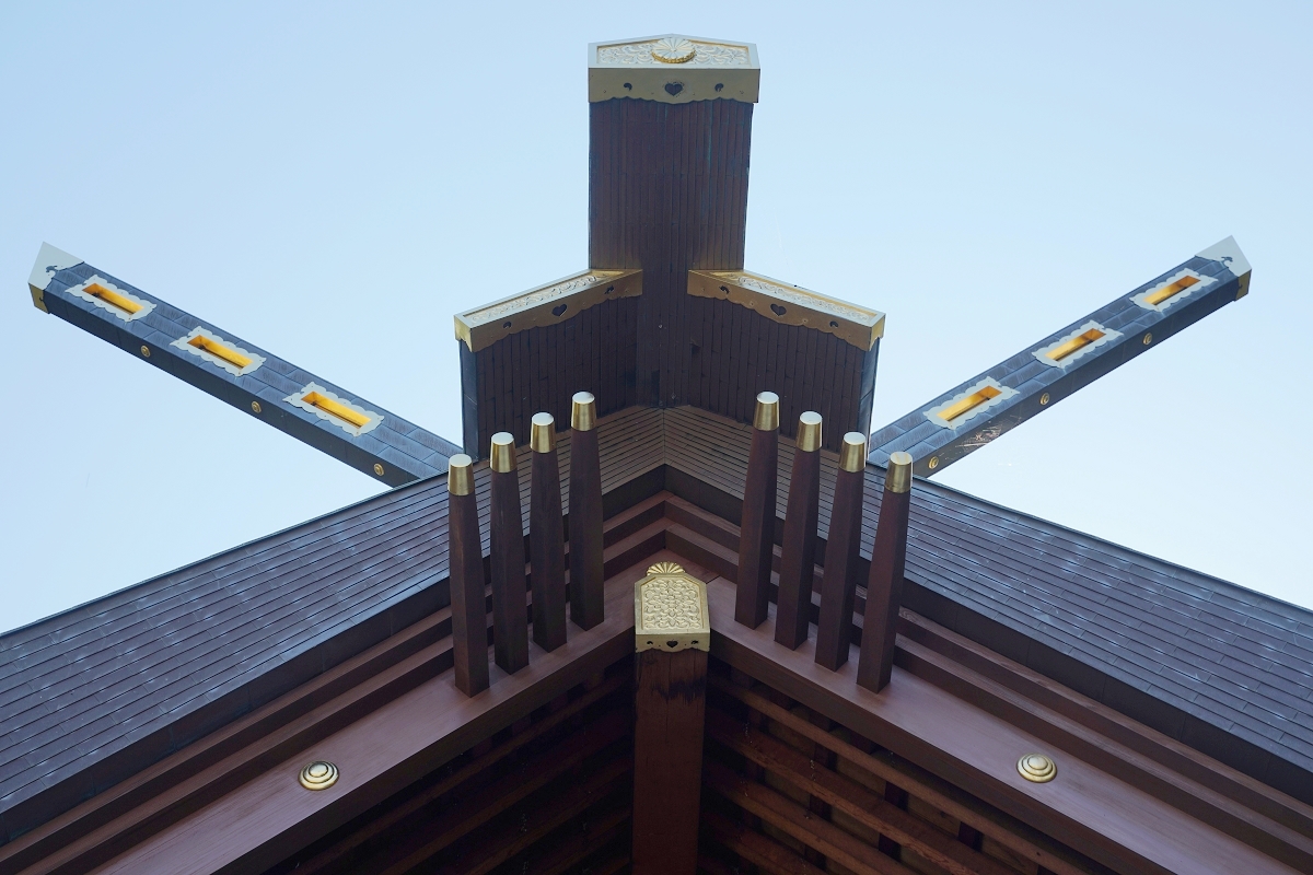 拜殿與本殿均為木造建築,拜殿的屋頂以切妻屋簷為特色,中文為「懸山 頂」,指的是屋簷會超過山牆,主要是提供建物本身額外的防雨能力,而神社屋頂交叉的裝飾木「千木」頂端外削,可以看出本殿供奉的是男性神祇