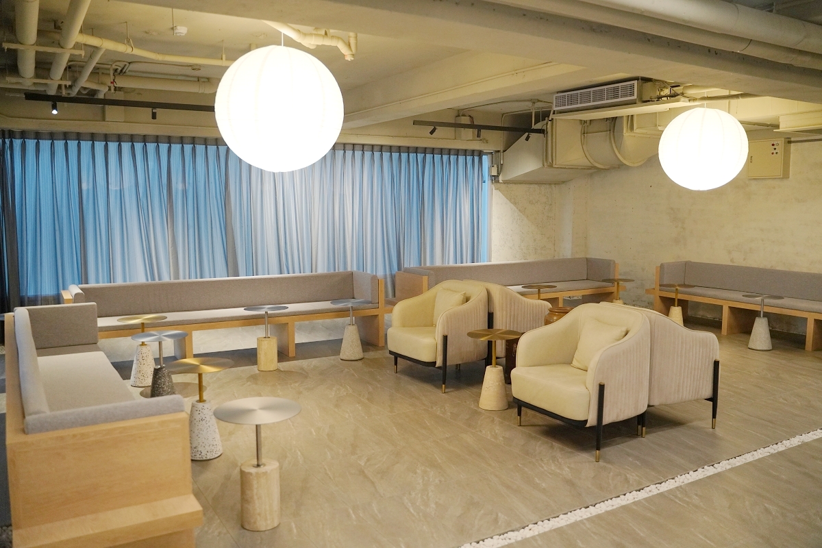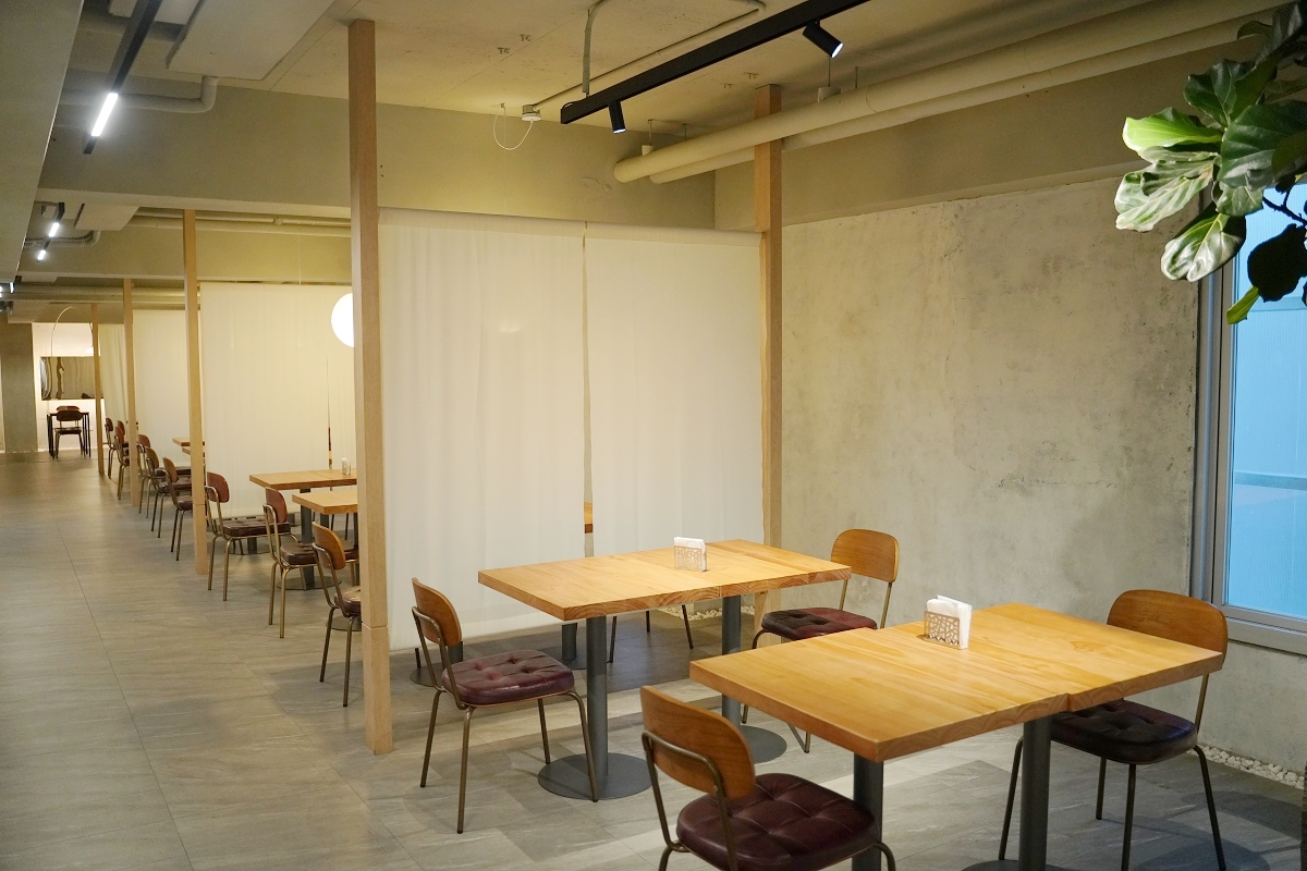 清新舒適的大廳休息區,木質椅搭上灰色系沙發坐墊還有可愛的桌子空間超寬廣