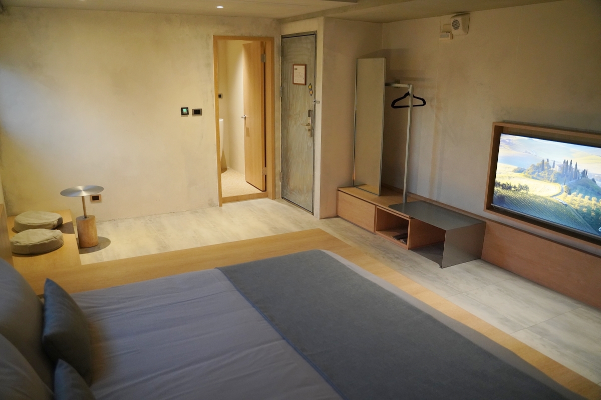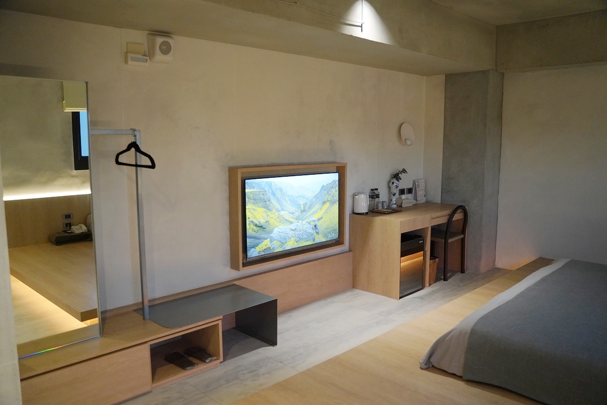這間是我們入住的雙人房有著日式簡約風格,該有的設備都有換鞋區、全身鏡、小沙發區、電視,比較特別的是入口門上有二個磁鐵,因為沒有房卡,所以退房時要把退房的磁鐵貼在門口就會有人來打掃