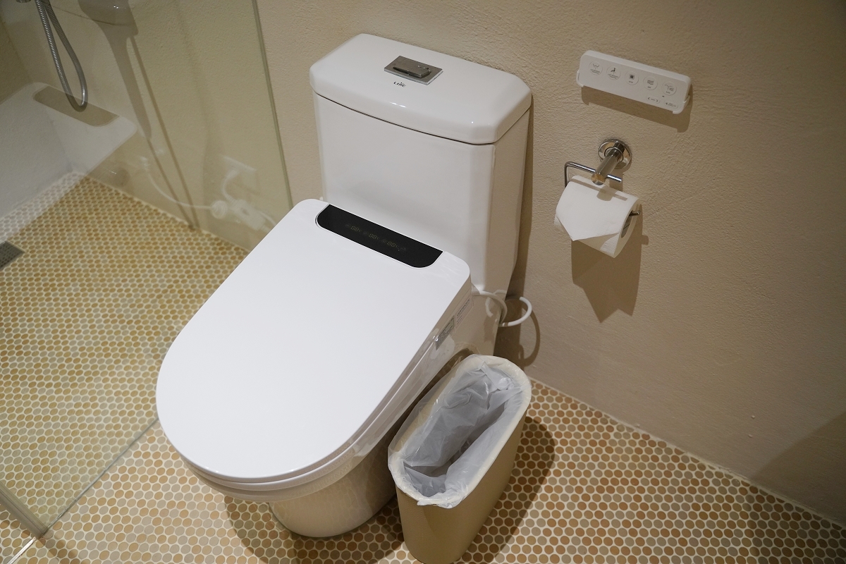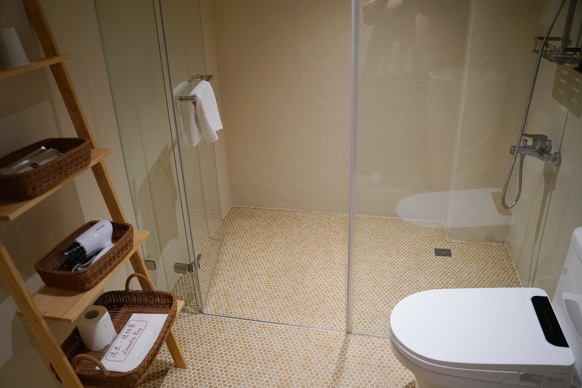廁所相當明亮採乾濕分離,地板是圓型的馬賽克磚有微止滑功能,對於我們有帶小朋友來說較為安全些,木頭階梯上放著各式各樣的盥洗用品,吹風機也是大風量,對於我們長髮來說相當重要,7樓的水量相當大,洗起來很舒服也不會忽冷忽熱