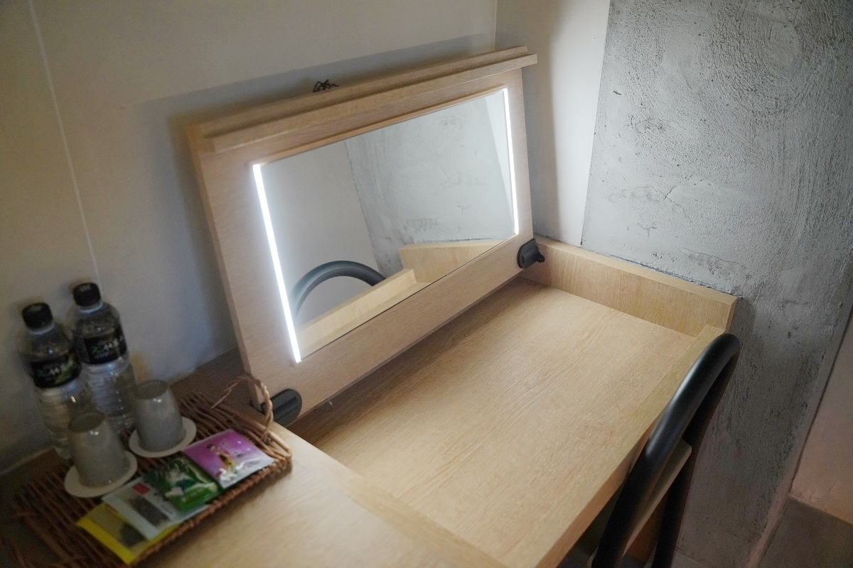 化妝台的桌面一掀開就是帶燈的化妝鏡,這樣的設計還滿節省空間的,瓶瓶罐罐都可以收在櫃子裡,看起來就會比較不雜亂