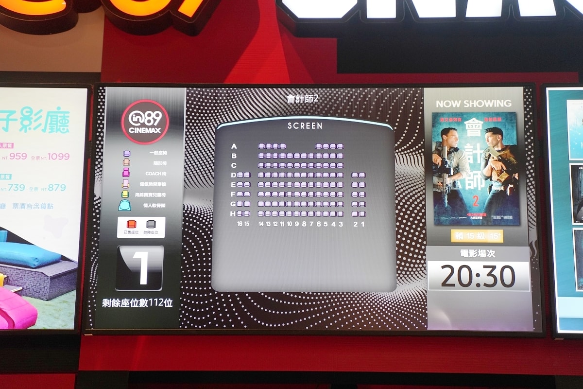 售票處的螢幕上都會秀出目前上映的電影以及廳別,不同顏色的座位代表不同的座椅,像是有一般座椅、隨形椅、COACH椅、佩佩豬兒童椅、海綿寶寶兒童椅以及情人懶骨頭等,在買票的時候就可以自由挑選想要坐的位置以及座椅