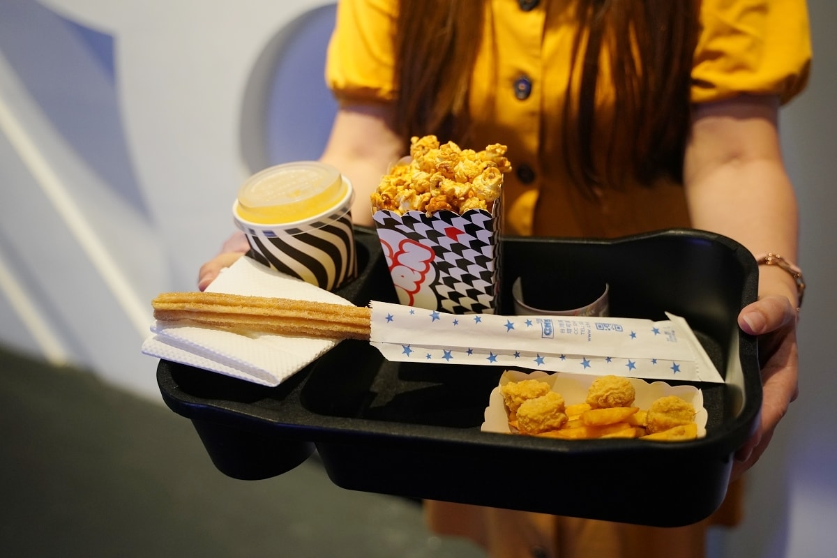 買完電影票以及餐點後,發現他們還有提供餐點托盤耶!這點真的超貼心的,如果沒有餐點托盤的話,每次都要手拿著飲料和爆米花,有時候真的會手忙腳亂的
