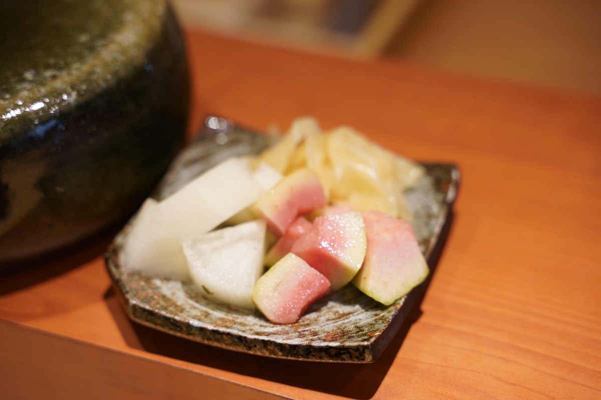 桌上的小菜都是店家自製的,有甜甜辣辣的薑片、多汁又酸甜的醃蘿蔔以及少見的紅心芭樂,享用餐點的過程中,都可以享用小菜來去除口腔內的味道
