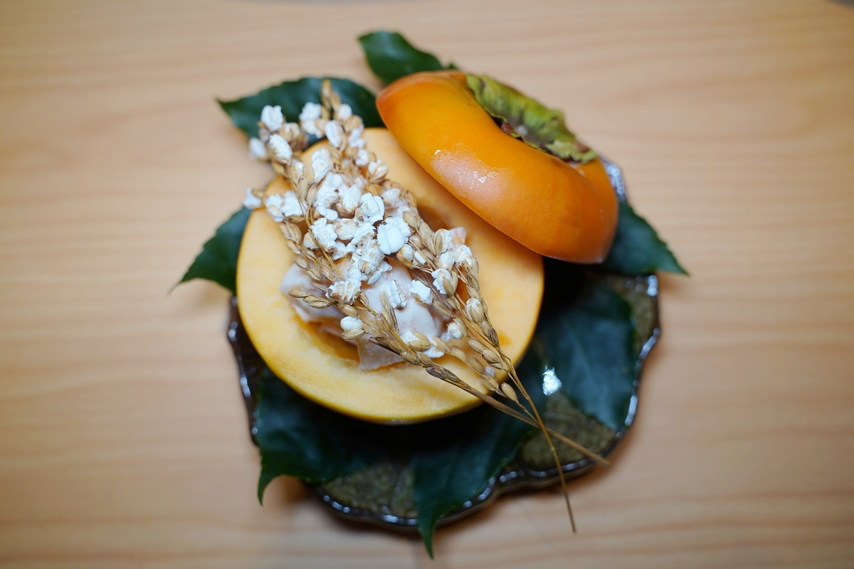 這是一道以秋季當季食材柿子為主題的料理,上頭擺放的是油炸過的稻穗,炸過後會變成爆米花,比起用玉米爆的,口感會比較札實一些,但仍有滿滿的蓬鬆口感