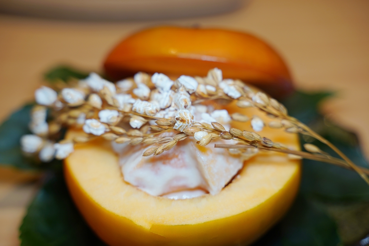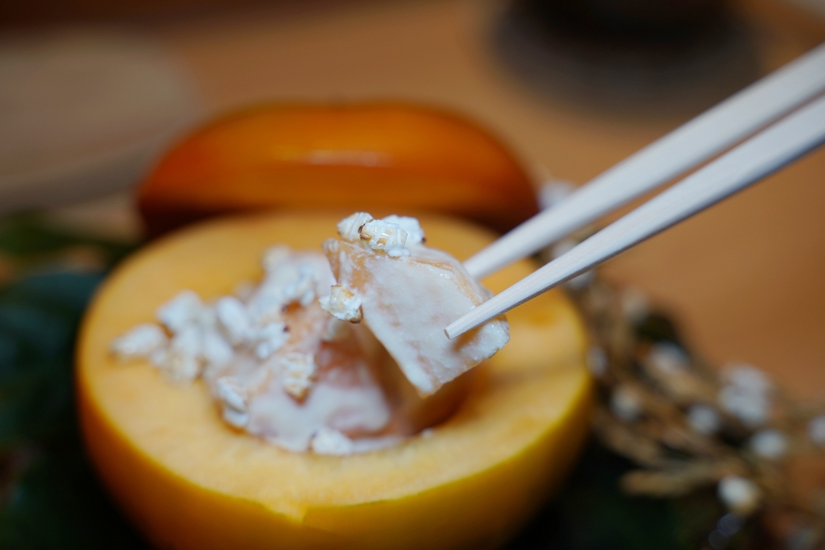 除了可以吃到香甜的柿子果肉外,底層還有木棉豆腐、蘆筍和北海道蘿蔔,味道酸甜相當開胃
