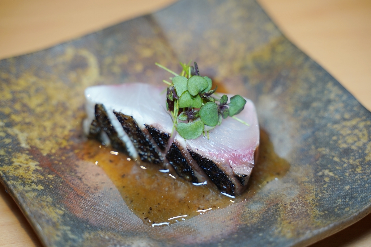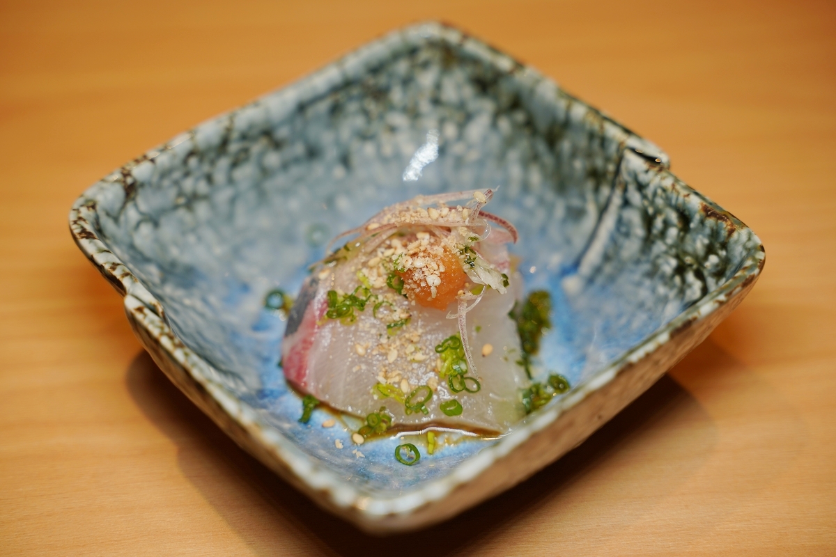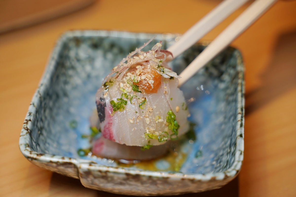日本愛媛縣大竹筴魚 シマアジ(縞鰺)又稱為白甘,一入口就可以感受到白肉魚的清甜,油脂很豐富,在口腔裡是越嚼越香,調味真的很棒