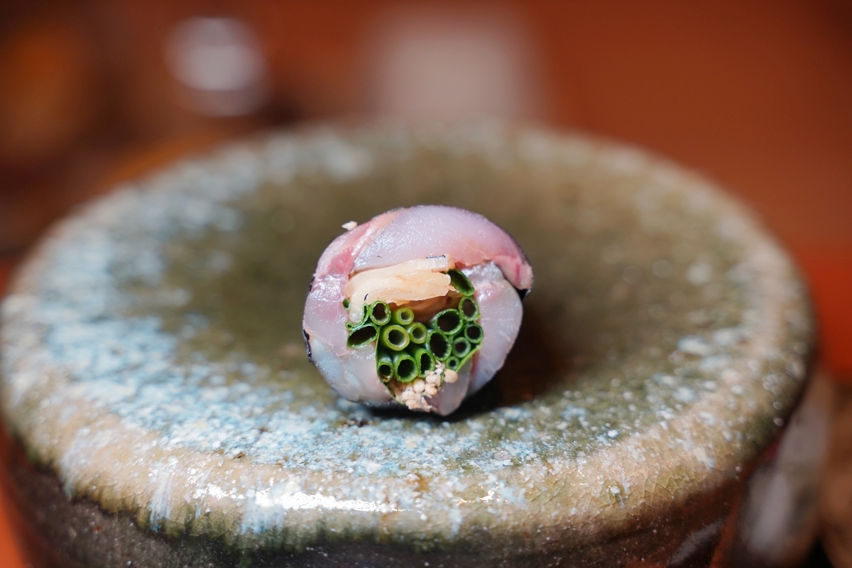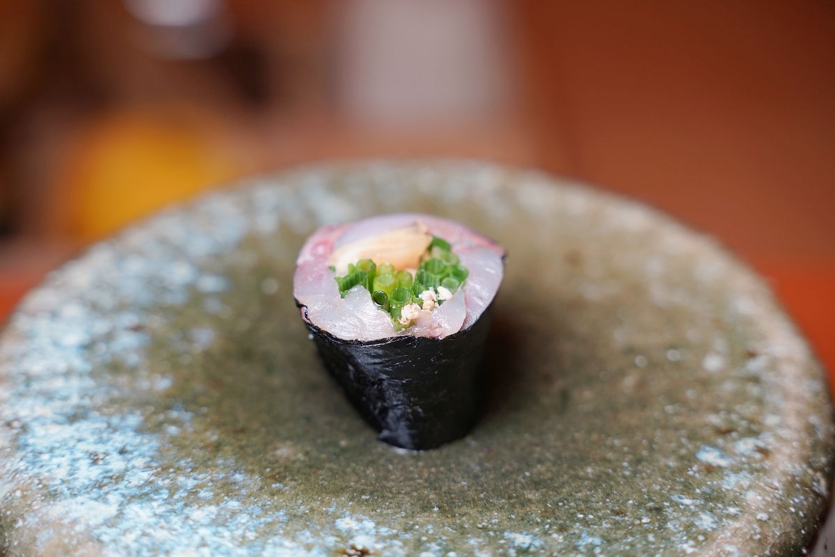 磯邊卷是一種使用海苔的料理名稱,這道竹莢魚磯邊卷可以吃到魚肉的Q彈、薑片的辛辣以及日本萬能蔥的口感