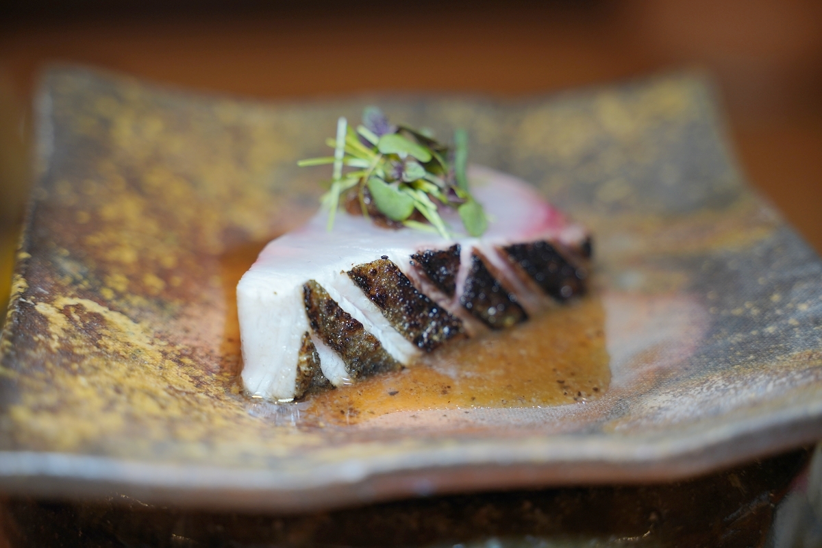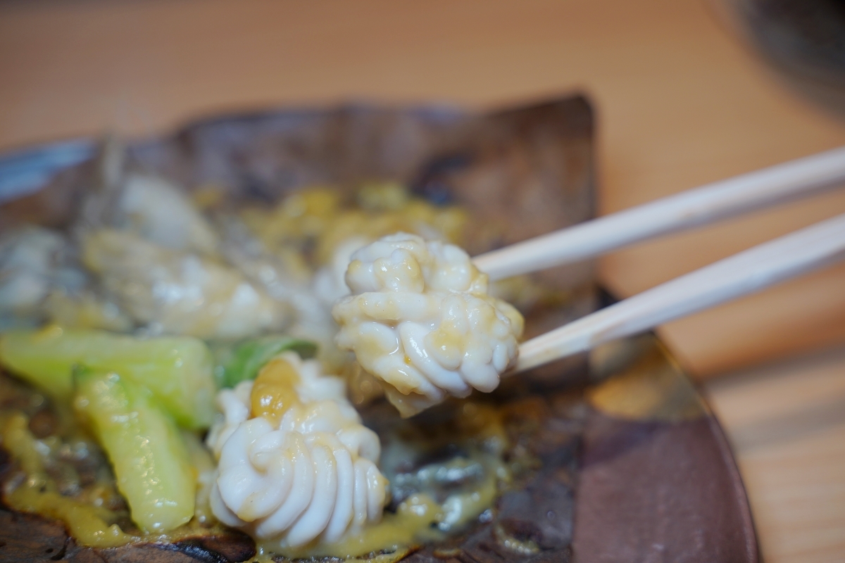 愛吃白子的朋友一定可以感受到,一入口那綿密的口感非常迷人,搭配特調味噌醬濃郁可口,一旁還有蘆筍可以享用,一口一塊白子,簡直太享受了