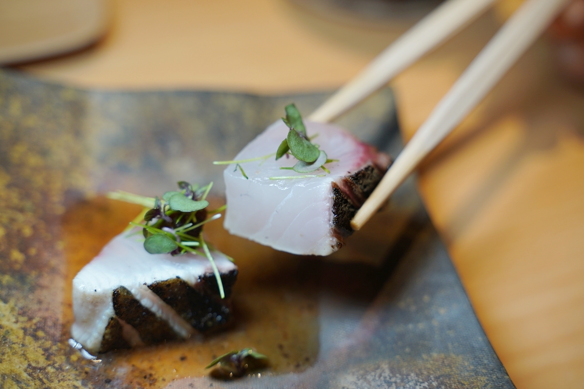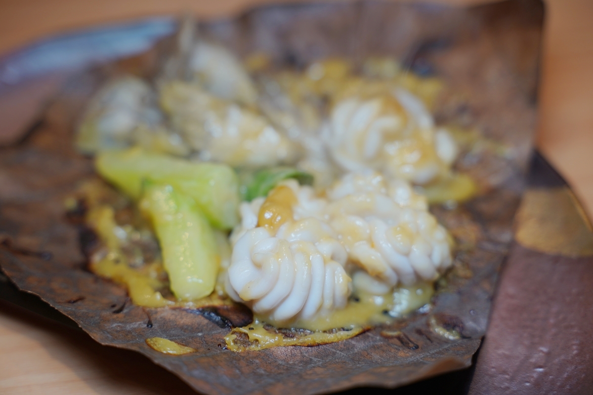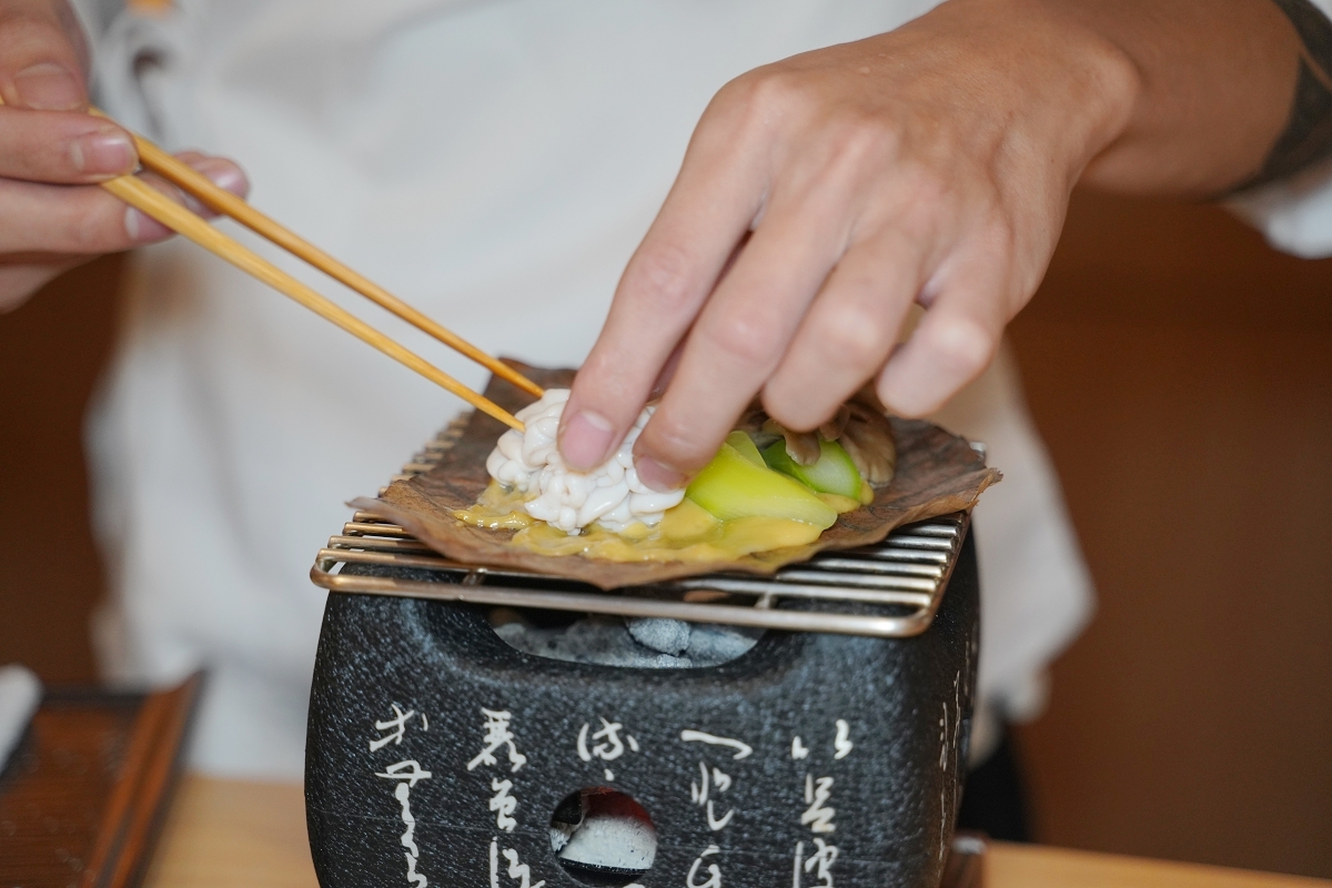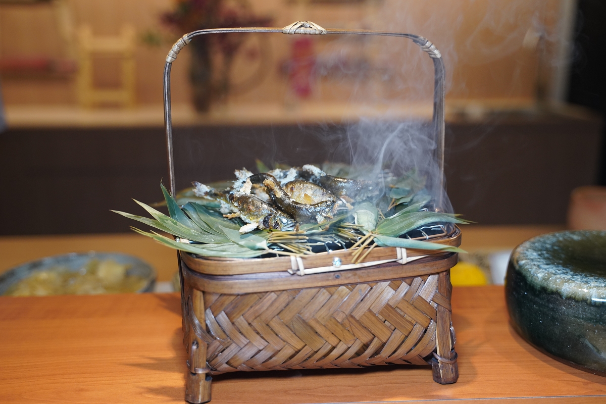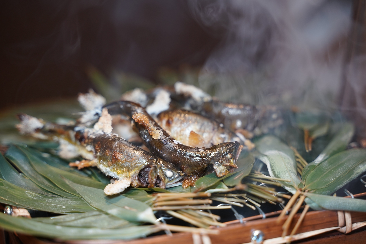 來自宜蘭的小香魚,抹上鹽巴後烤炙,上桌時用竹籃加上備長炭營造出煙霧繚繞的感覺