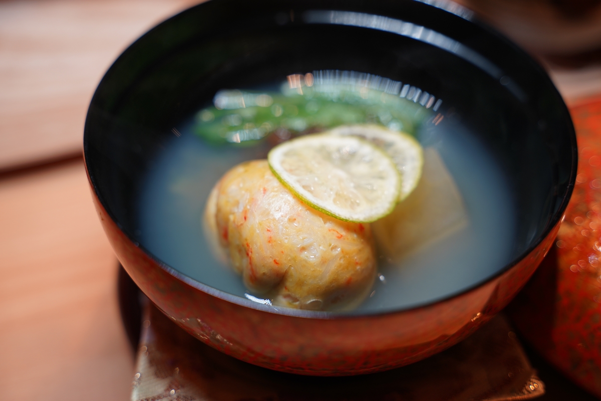 這湯品可以吃到越南冬瓜、酸橘2片、昆布絲、野生蛤蜊湯底以及用松葉蟹肉與魚漿製作而成的真丈しんじょう