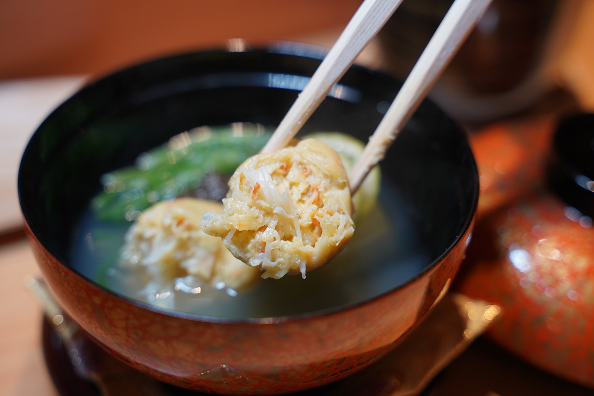 真丈的歷史可以追溯到江戶時代,它是日本料理中的一種蒸物,常用於懷石料理或高級日式餐廳,這裡的真丈吃起來的口感很輕盈蓬鬆,還有滿滿的松葉蟹肉,吸飽湯汁真的好好吃