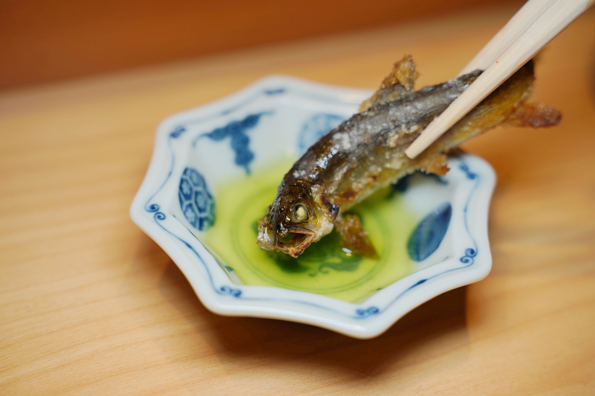 香魚是一種對水質非常挑剔的魚種,需要在無汙染的山泉水中養殖,香魚跟苦花一樣會攝取溪中岩石上的矽藻,所以香魚的肉質會有淡淡的香氣故稱為香魚,而宜蘭山泉小香魚就養在水質極佳的宜蘭冬山地區,搭配的是露草醬,吃起來會有香魚的甘和露草醬的酸,一口吃下可以讓人感受到人生豐富滋味
