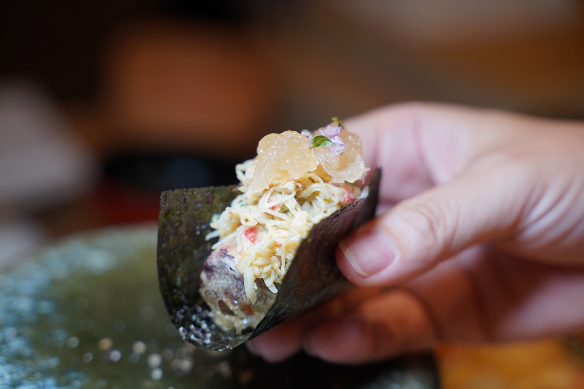 接下來這道料理的食材非常豐富,可以吃到水蜜桃凍、松葉蟹肉以及炸無花果,一口咬下那味道無比的融合,有水蜜桃的甜、蟹肉的鹹香以及炸無花果的綿密口感