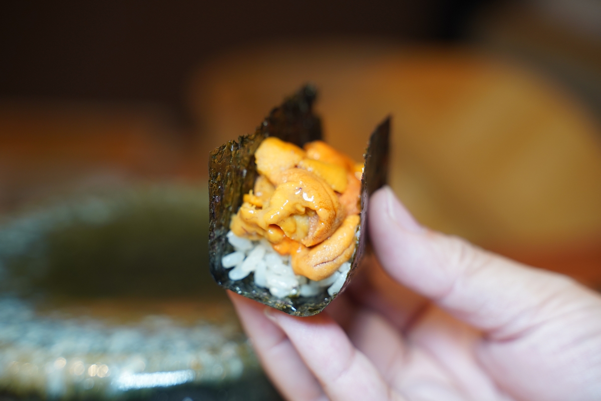 要享用海膽最簡單的方式就是用海苔包起來,然後加點醋飯就行了,大口吃下,那海膽的濃郁馬上充滿整個口腔,水果的鮮甜味非常明顯,愛吃海膽的朋友一定會吃得非常滿足