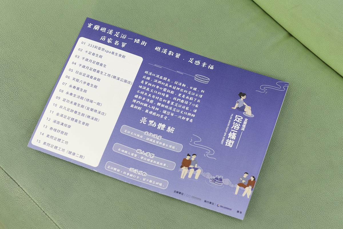全台第一條足浴主題品牌街區「宜蘭礁溪足浴一條街」就在宜蘭礁溪,2021年起,經濟部商業發展署攜手商業發展研究院(CDRI)打造「品牌一條街」計畫,至今已成功行銷全台22條特色品牌街區,而這次焦點就在宜蘭礁溪,活動日期從10月4日(六)起至10月31日(五)「礁溪散策.足感幸福」正式登場,結合15家在地人氣足浴店,推出「職人導覽」、「互動任務」、「數位闖關」等精彩體驗,可以一次玩遍礁溪的足浴文化與在地美食,從街角的泡腳池到專業養生館,無論你想輕鬆泡、深度泡,這裡都能讓你「足感幸福」,身心靈一次滿足,快揪朋友一起來礁溪開啟最Chill的小旅行吧!!
