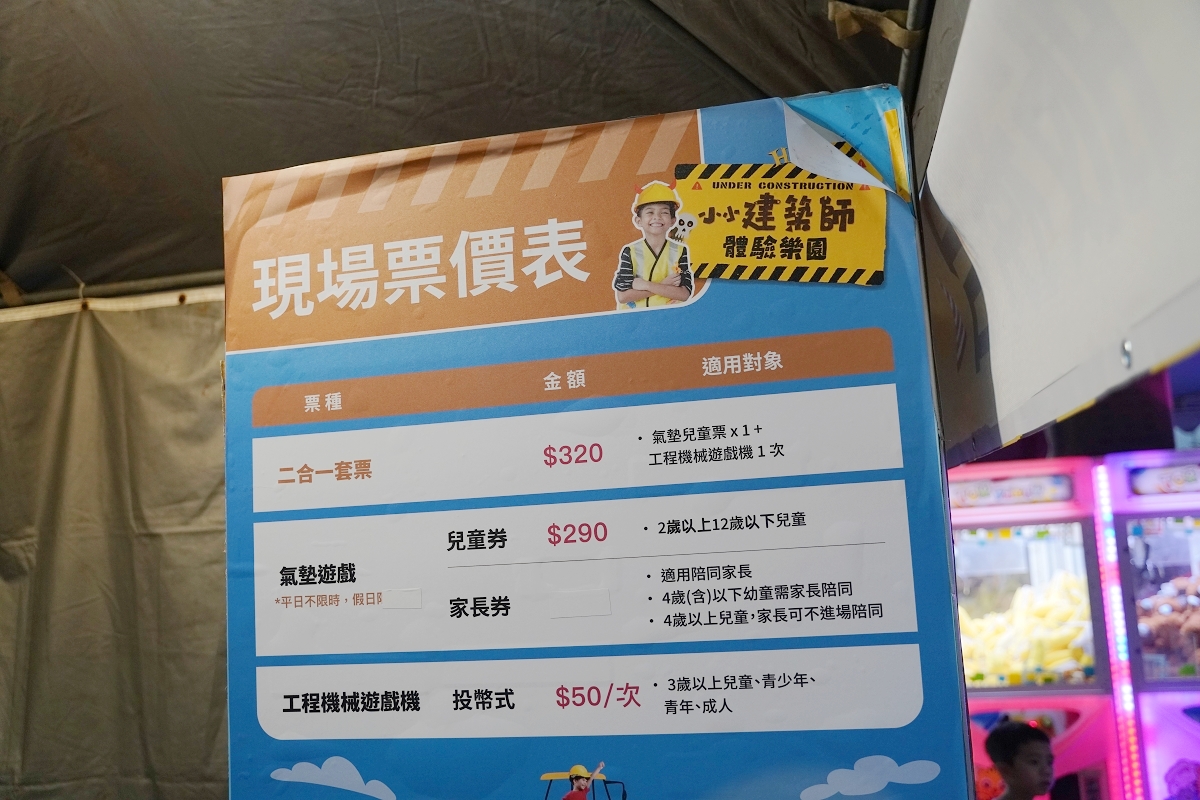 二合一套票:320元-氣墊兒童票+工程機械遊戲機1次