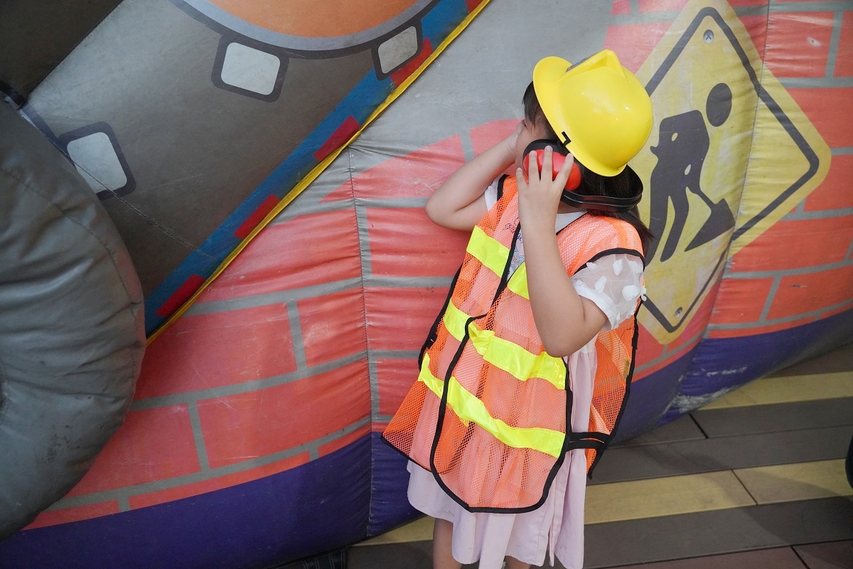 小朋友可以穿上反光背心、戴上安全帽和耳罩就可以化身工程師來拍照