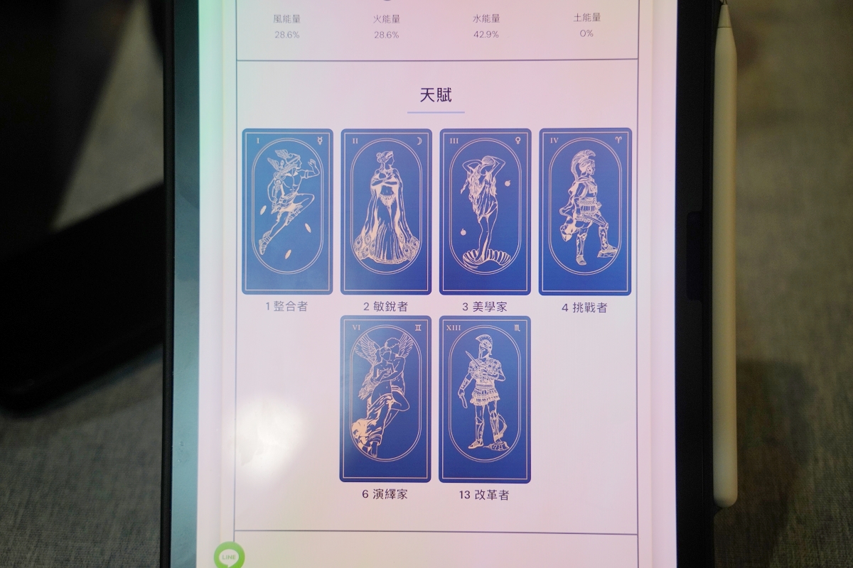 輸入個人出生年月日後,就會出現每個人的天賦牌,解盤師當下會針對每張牌來解說其意義