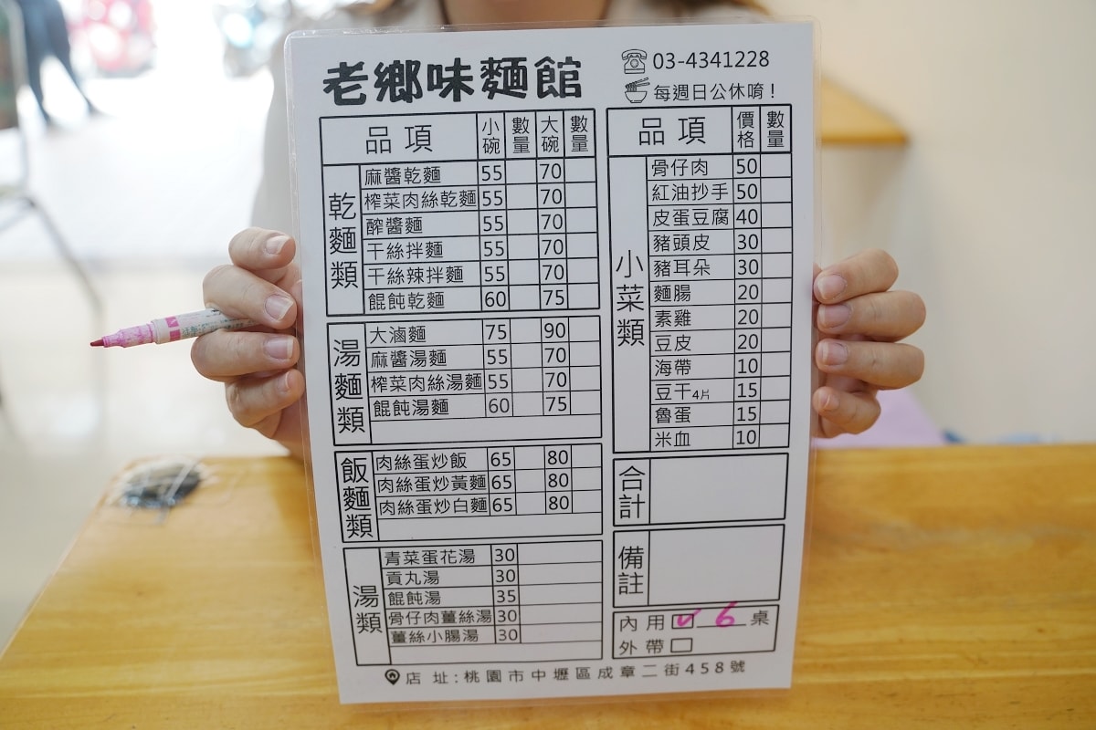 老鄉味麵館有各種乾麵、湯麵、飯麵類、湯類以及小菜類,價格落在55元到90元之間,價格不貴可以讓人吃得飽飽的