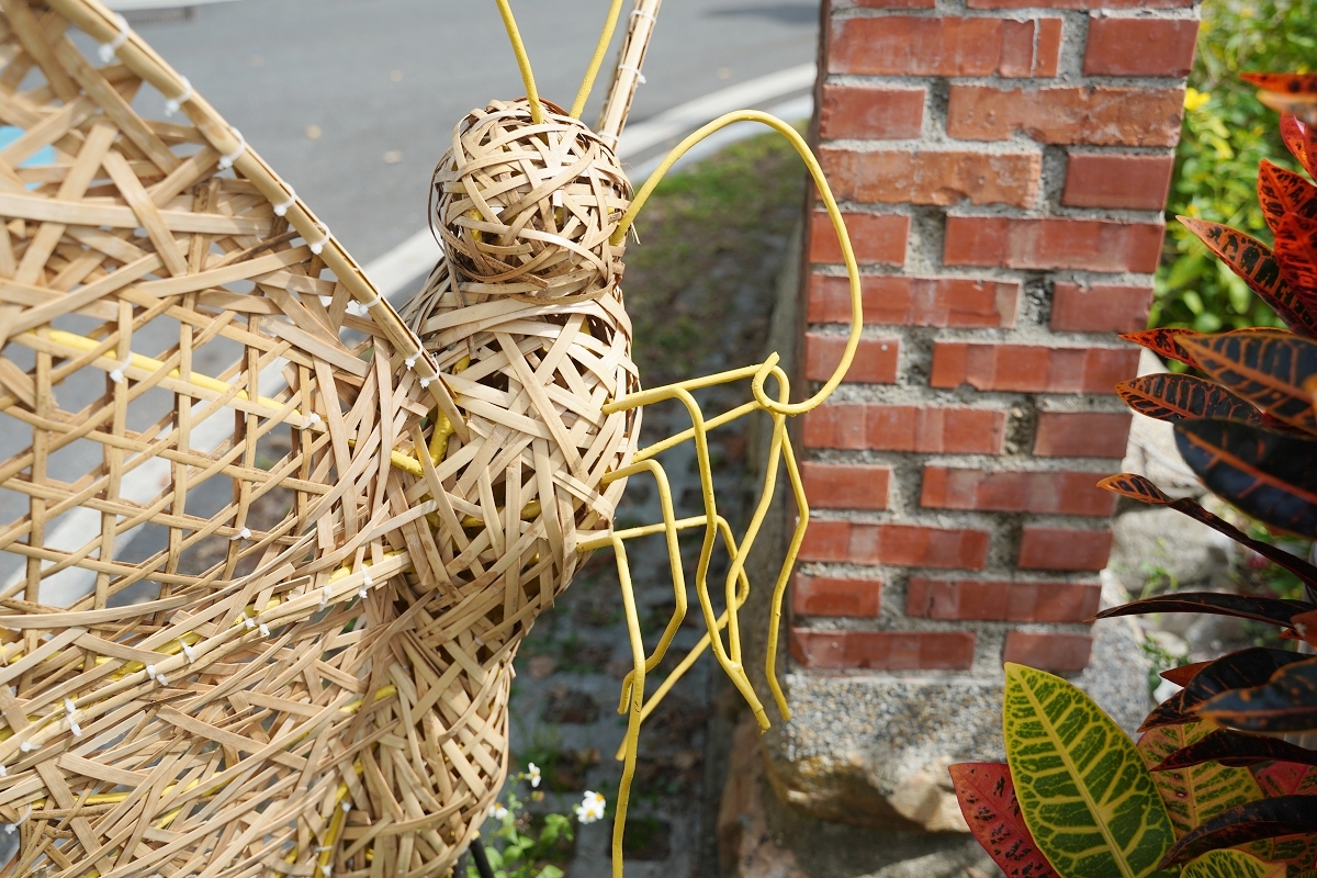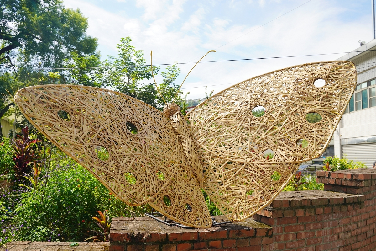 蝴蝶竹編作品就停在磚牆邊,就好像真正的蝴蝶停在牆上休息一下優雅