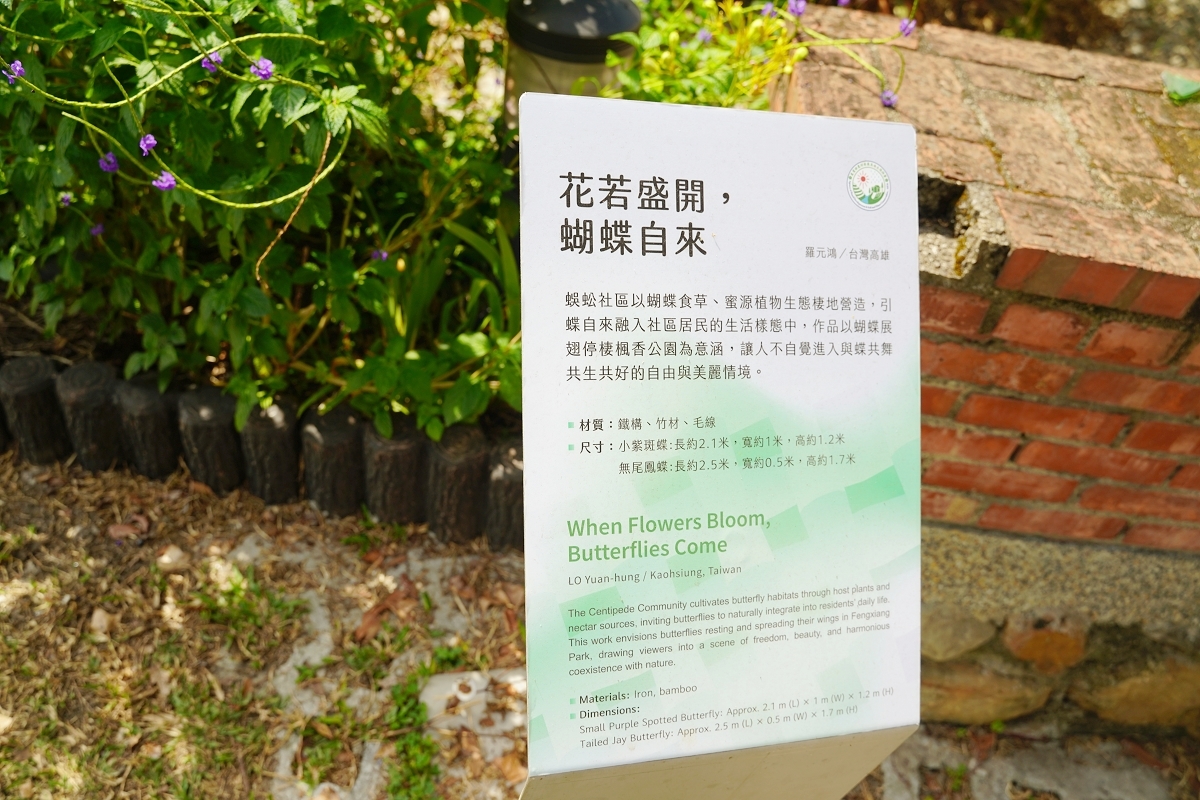 南投埔里蜈蚣社區內有一座「楓香公園(楓香巨木群)」,它是埔里921災後重建所規劃設置的景觀休憩點,依據台灣省政府農林廳1989年「巨木巡禮」記載,當時有22棵楓香巨木群,並在農林廳經費補助下,建有涼亭、花壇、避雷針與解說牌,楓香是低中海拔山區的原生大喬木,有名的奧萬大賞楓就是此樹種,目前僅剩5棵楓香樹,樹高約30公尺,胸圍最大達480公分,現在來到楓香公園除了可以一賞楓香樹的壯觀外,還多了「生態竹舞裝置藝術」可以拍照打卡,藝術家 羅元鴻先生以蝴蝶展翅、蜜源植物與社區共生為構想,打造出「花若盛開、蝴蝶自來」這件作品,他運用了鐵構、竹材與毛線建構出生動的小紫斑蝶與無尾鳳蝶,象徵蝴蝶們在蜜源植物當中共舞的感覺,除了楓香公園外,蜈蚣社區內還有全國唯一的「平埔番祖廟」可以一訪,各位朋友如果有機會來到南投埔里,推薦可以把蜈蚣社區的楓香公園安排進行程景點當中唷!!