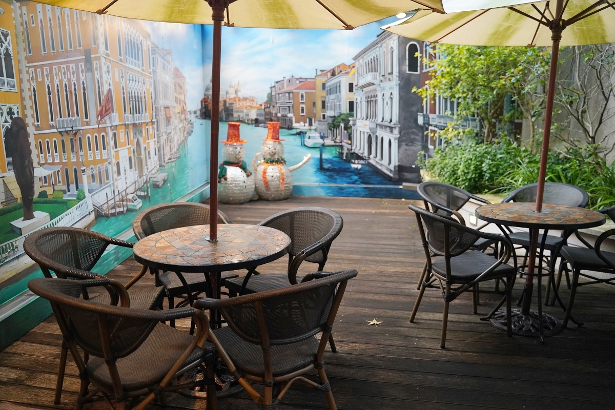 店後方有露天用餐區,牆面上的彩繪讓人有渡假感
