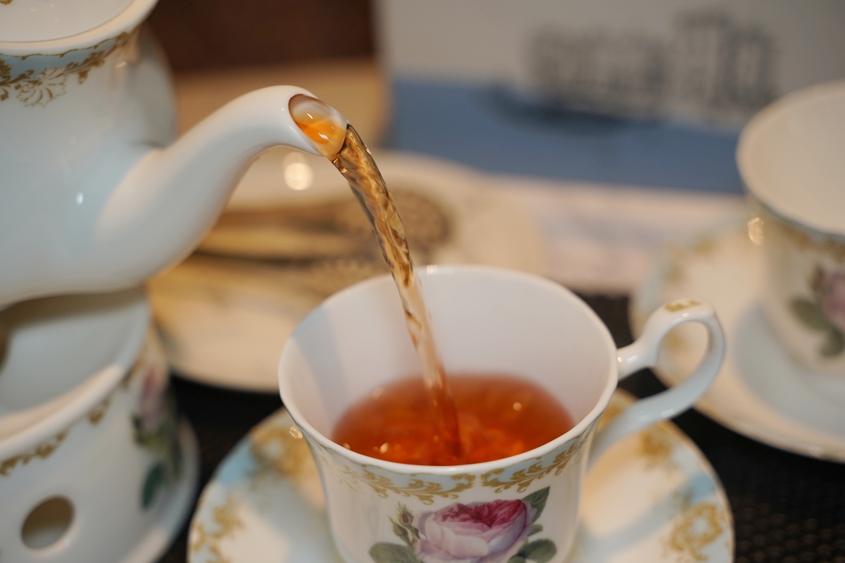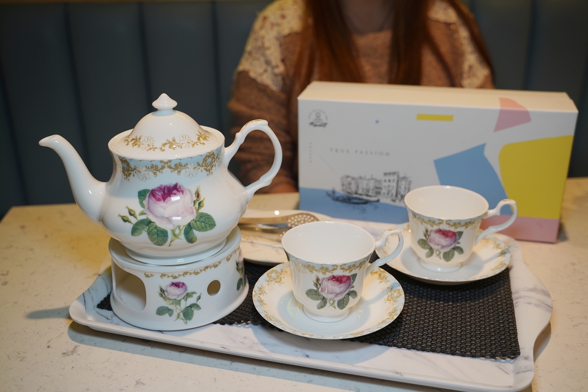 Maccanti 馬卡諦義大利冰淇淋桃園旗艦店的茶飲用的可是英國Roy Kirkham Vintage Rose骨瓷雙人茶器組,下午茶皆為熱飲、可回沖