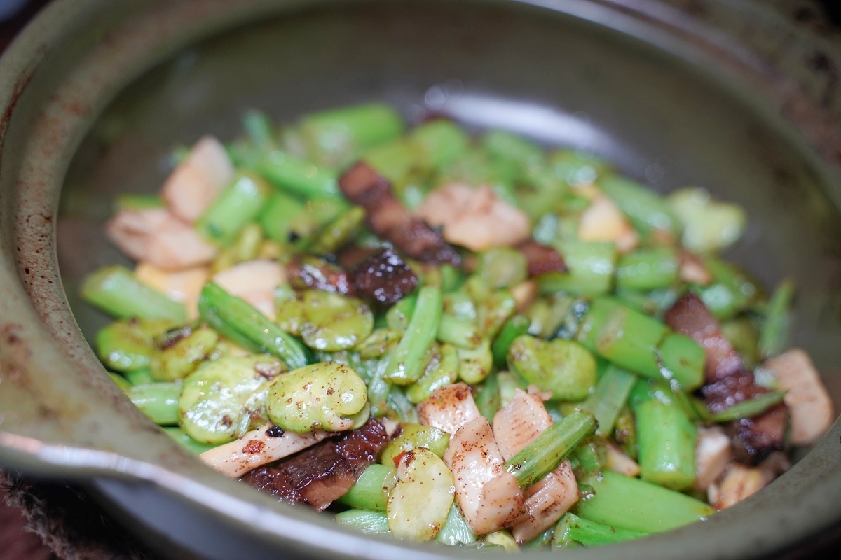 所謂春鮮四寶指的是菜苔、春筍、醬肉和蠶豆瓣,吃起來鹹香可口,滋味無窮