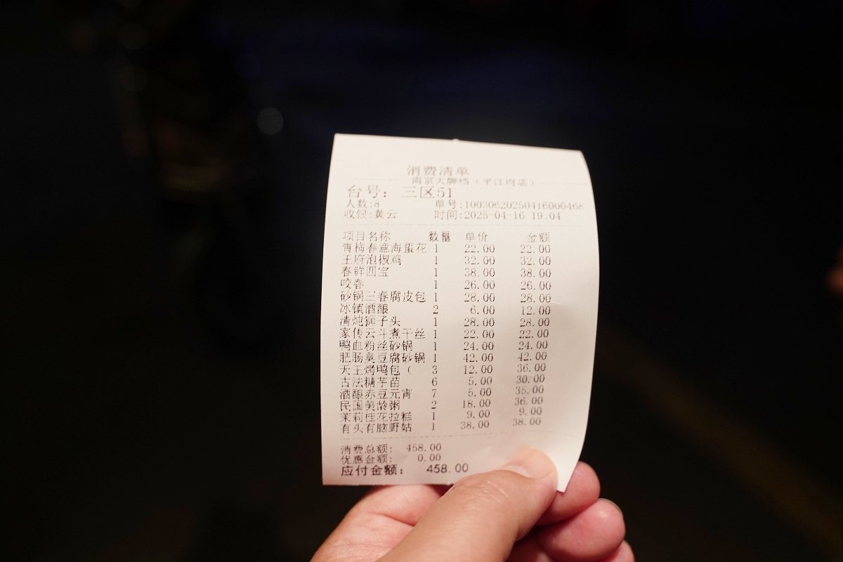 當天我們一桌人吃了人民幣458元,約台幣2000元,南京大牌檔雖然價格較貴一些,但味道真的還滿不錯的,而且用餐環境很獨特,還沒來吃過的朋友一定要來試試