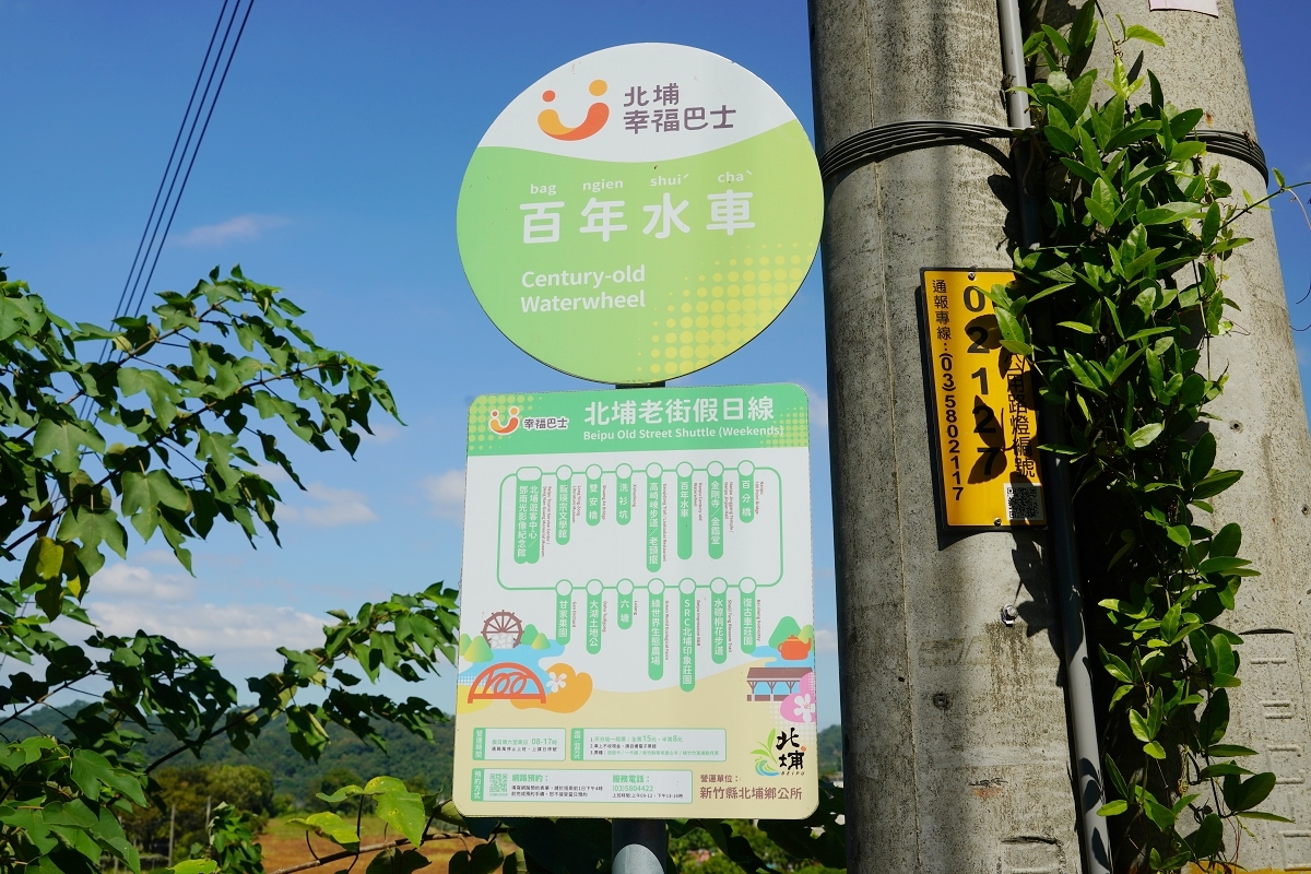 不開車的朋友可以搭乘「北埔幸福巴士」北埔老街假日線前往南埔各景點,北埔老街假日線,包含北埔遊客中心/鄧南光影像紀念館、龍瑛宗文學館、雙安橋、洗衫坑、高旗崠步道/老頭擺、百年水車、金剛寺/金鑑堂、百分橋、復古車莊園、水磜桐花步道、SRC北埔印象莊園、綠世界生態農場、六塘、大湖土地公、甘家果園,合計15站