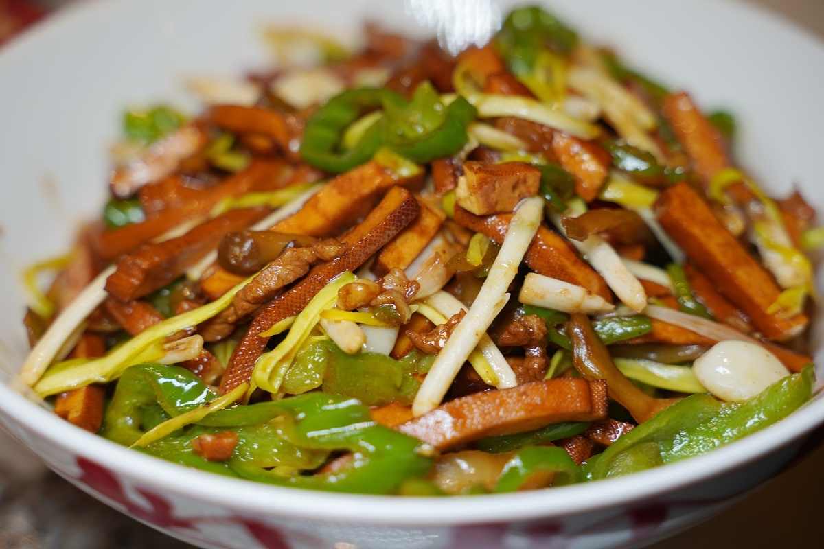 跟客家小炒有點像,吃的到各種食材切成條狀熱炒,有豆乾、肉絲、韭菜黃以及青椒,味道還滿香的