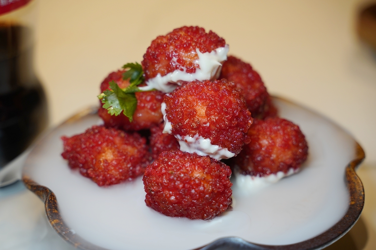 這道以荔枝為造型的餐點其實是蝦球,內餡有香濃有乳酪,味道真的還滿不錯的,好吃必點